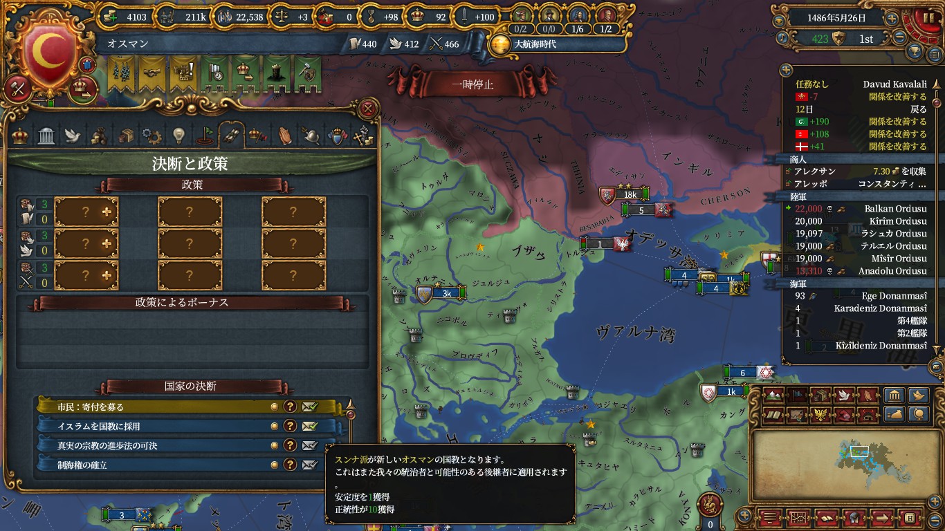 コンスタンティノープル*2からアナトリア側に遷都して支配的宗教をイスラムにして首都がイスラムであるため、ディシジョンから再改宗。