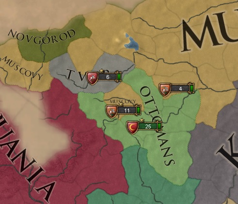 我が国は開始時モスクワ大公国は未発見状態ですので隣接プロビを得て自然発見されるのを待ちましょう。モスクワ発見を待っている間にアナトリアのコア州をさくっと回収しておくとなおよいでしょう。人的資源を温存するため傭兵のみで戦うのが得策かと思います。