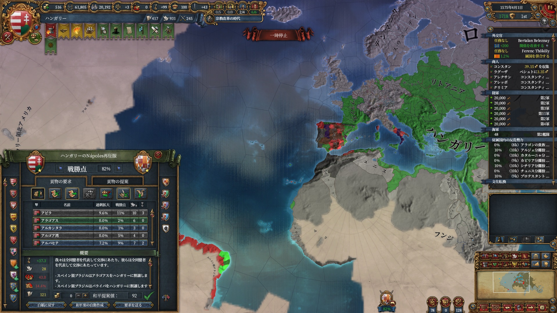 まだまだ続く再征服。ナポリ統合に伴いこちらも属国ナポリを作成して突っ込みます。