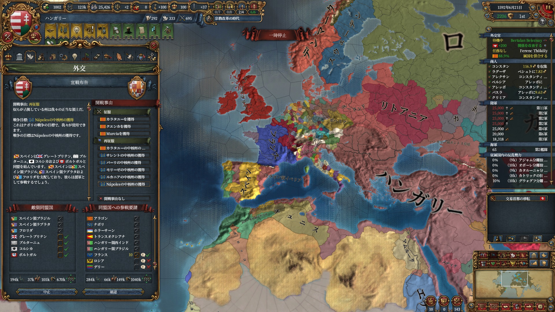 マムルークはもう気にする程ではないですが、スペイン+ポルトガルは結構な軍量になるので停戦明け放置は避けたいところ。
