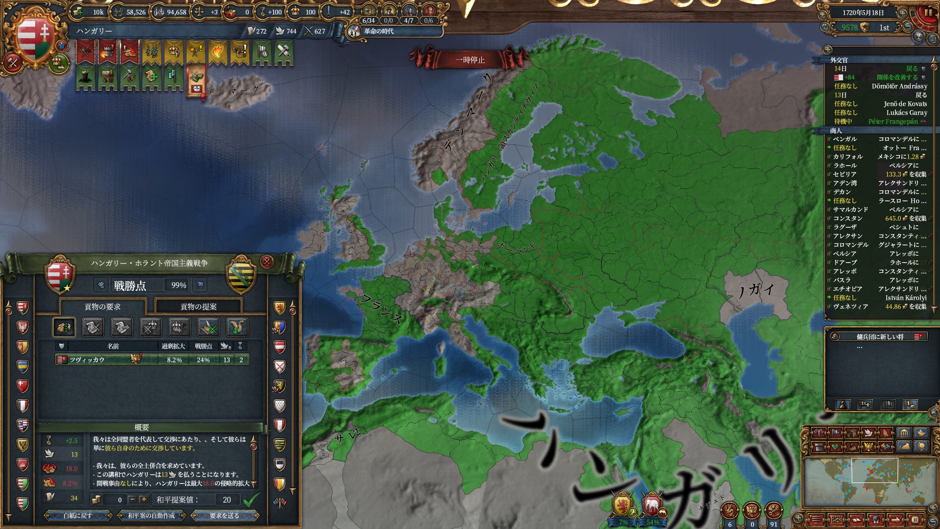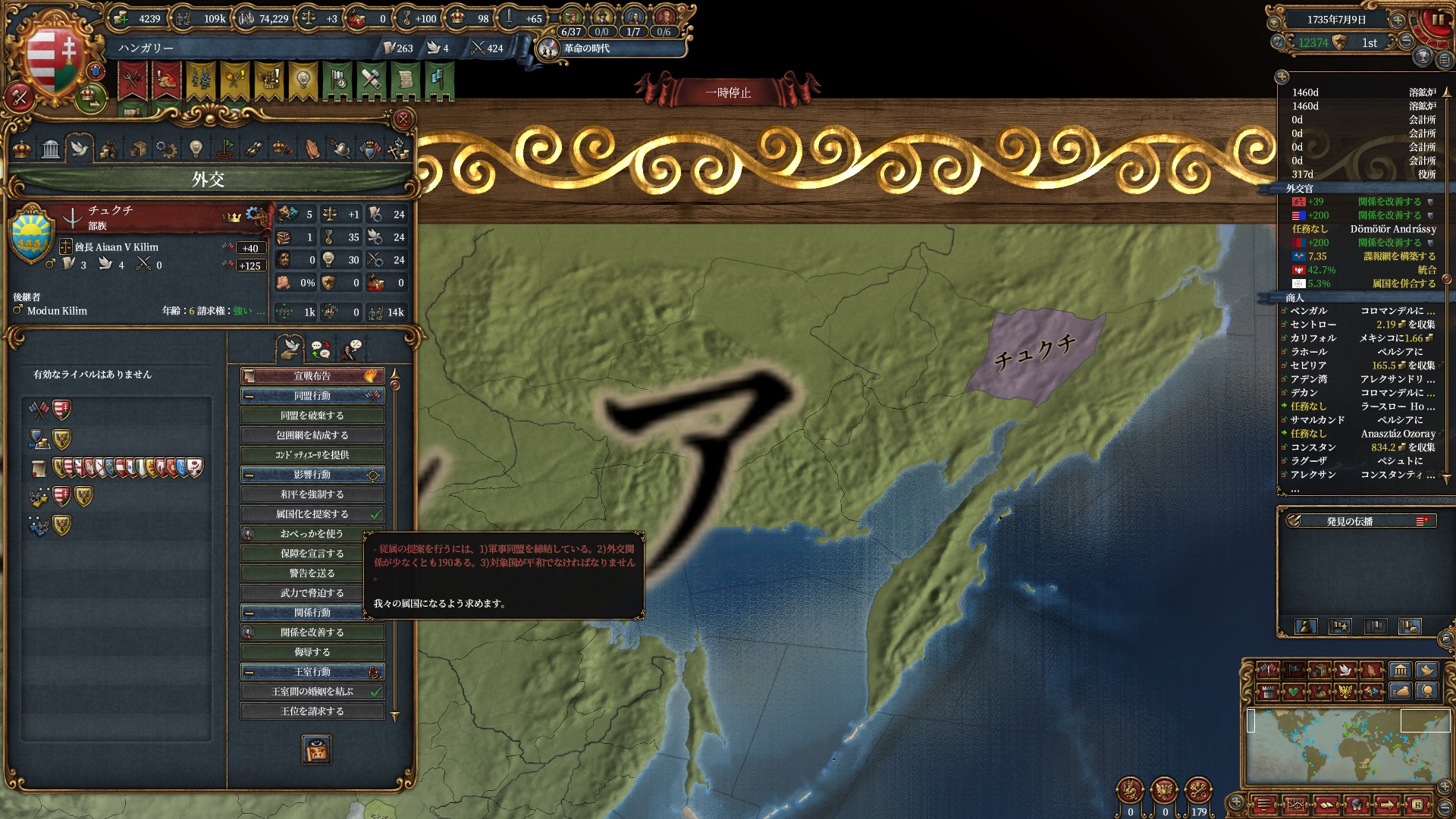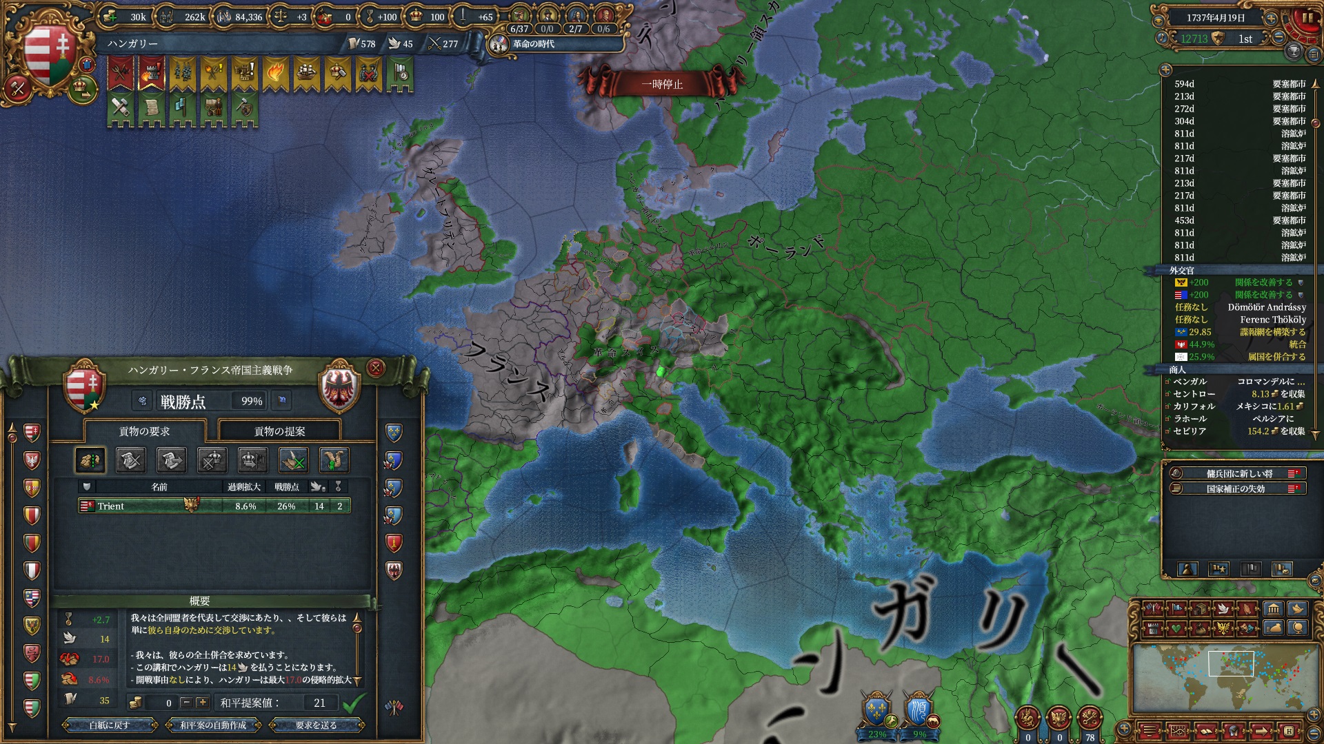 かといってポーランド統合後の観点ではハンガリーはそれら属国に対して全力でAEを飛ばしているため凄いマイナスopinionになっており、外交併合が行えない事が確定。