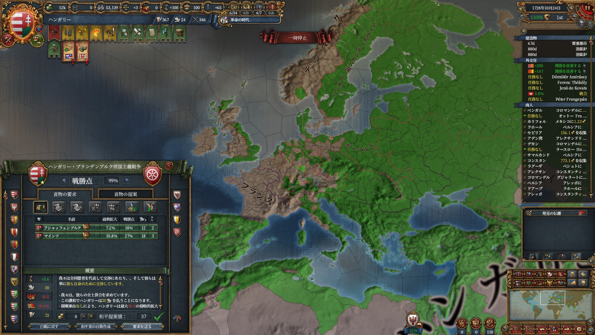 早速統治効率が55%に下がってしまい、ロシア戦の傷が癒えずMPも全然ありませんが戦争再開です。