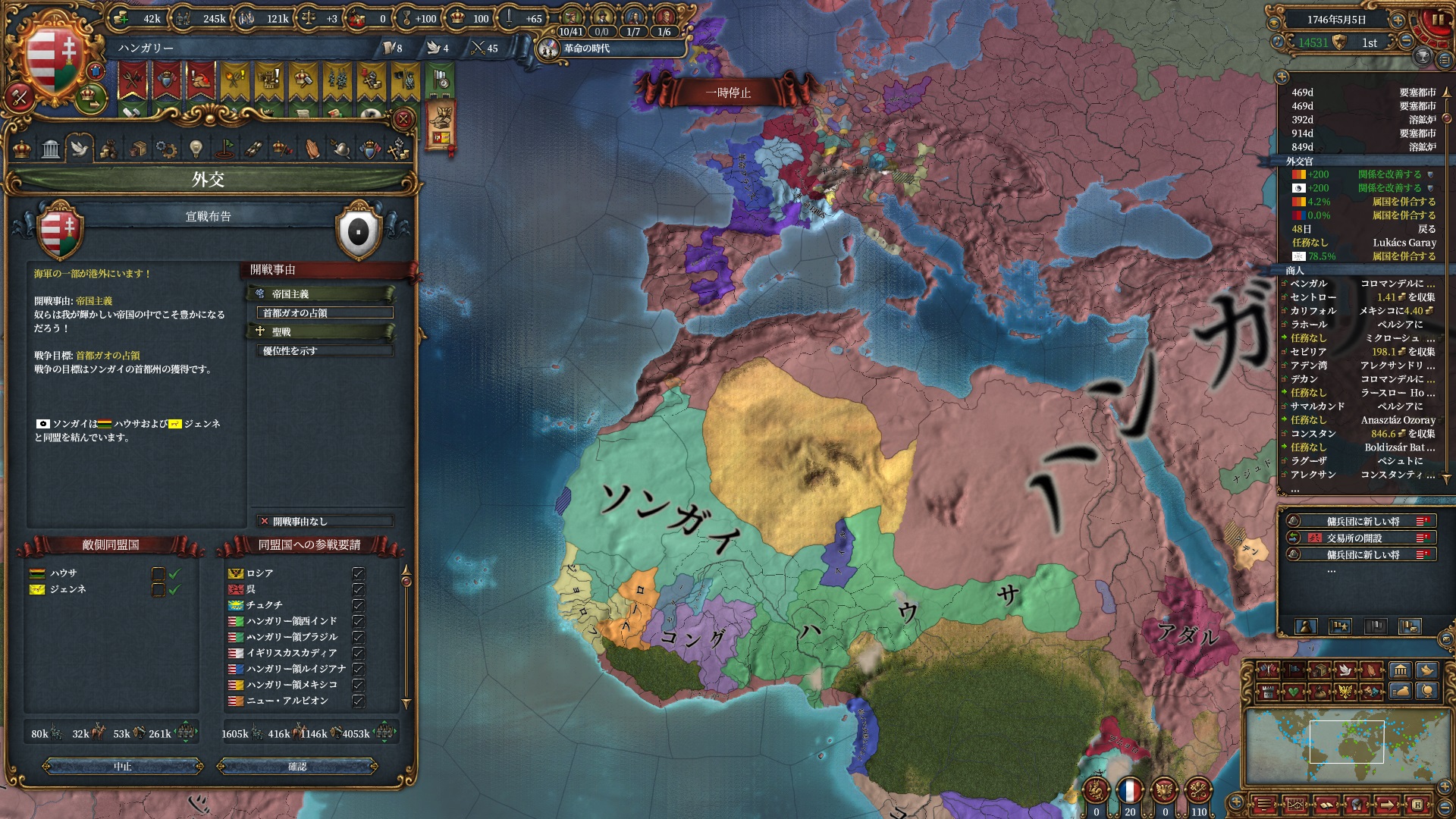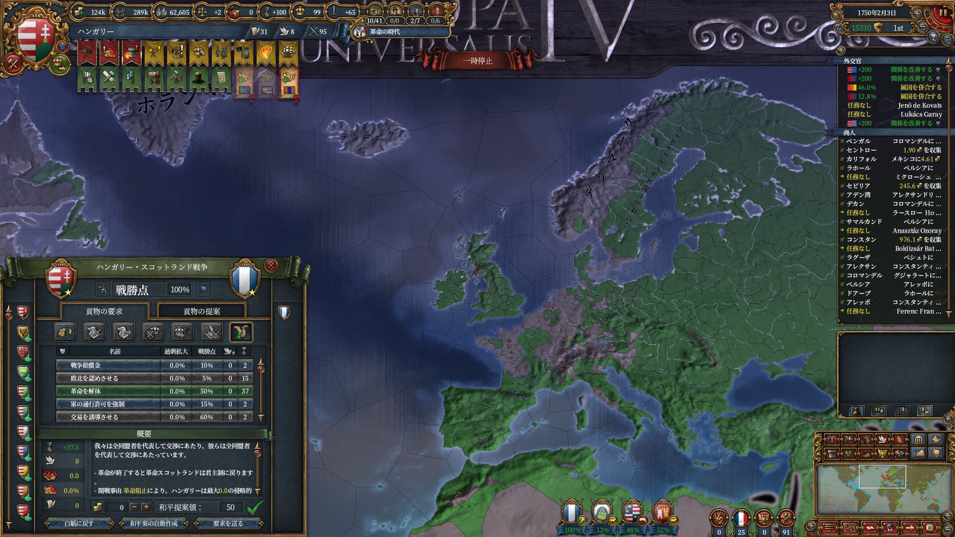 順は中華皇帝で天命0なのでいつでも倒せるため放置で、今メインで戦うべきはイギリス・ブルゴーニュ、そして今はまだ同盟国のフランス・ベンガルでしょう。