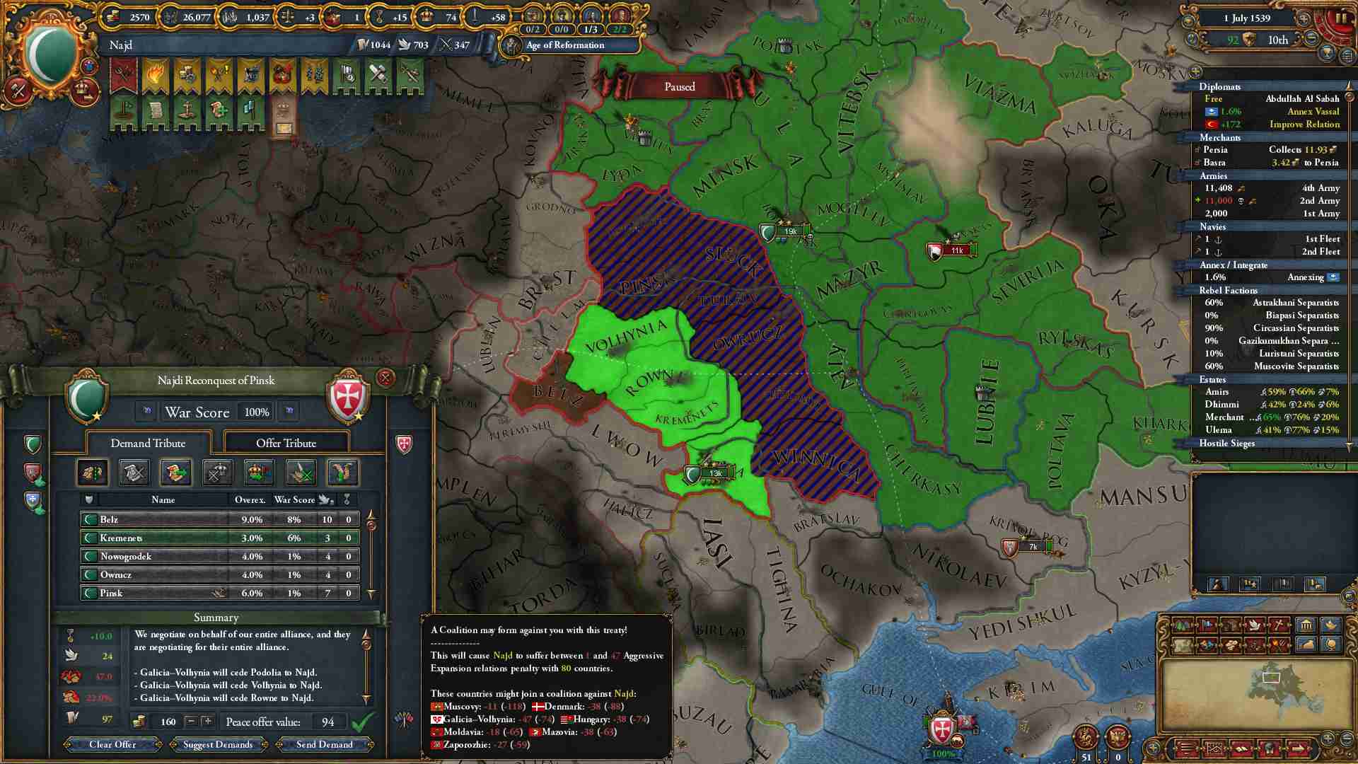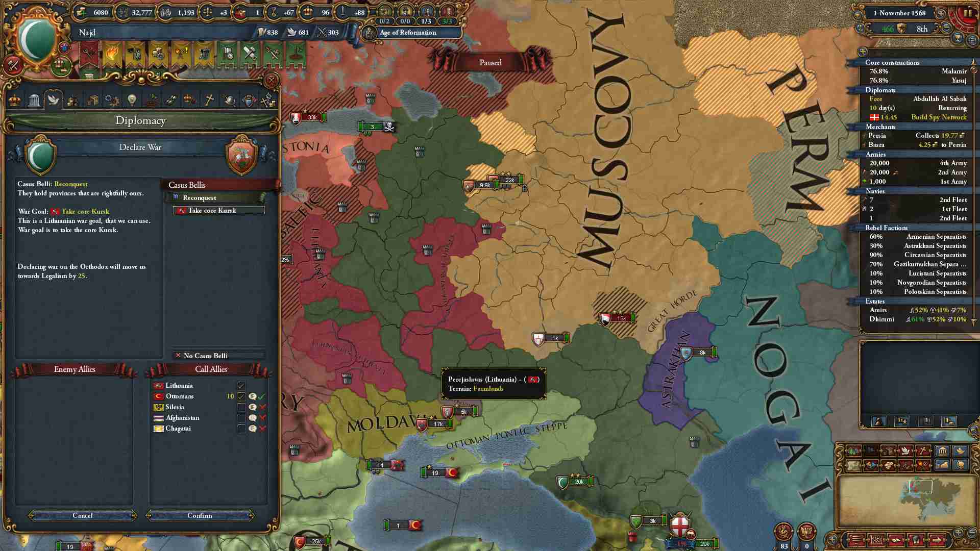 1535年9月 国土回復CB(第2次Muscovy戦の前に奪われたLithuaniaのコア)でGalicia-Volhyniaに宣戦布告