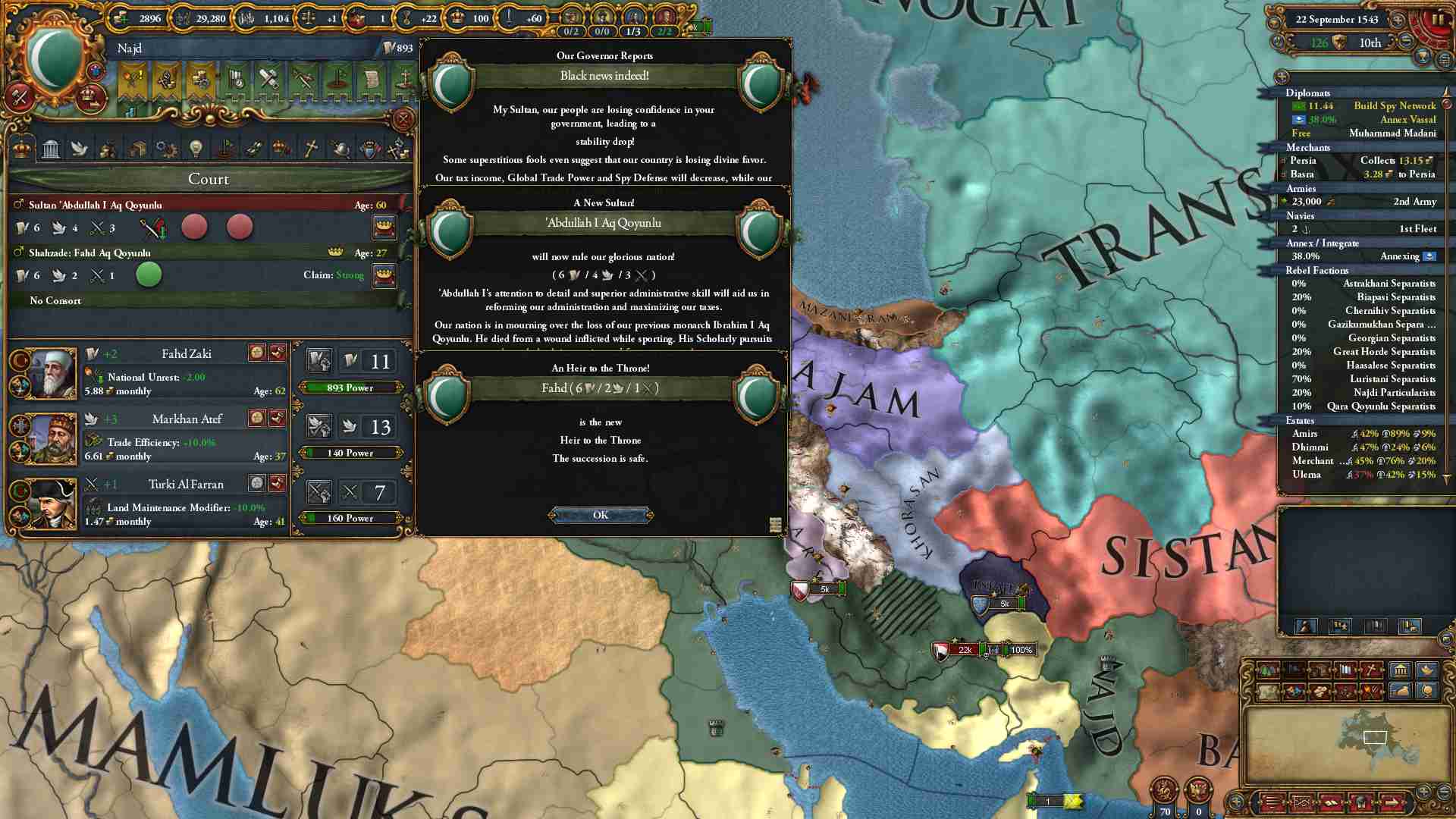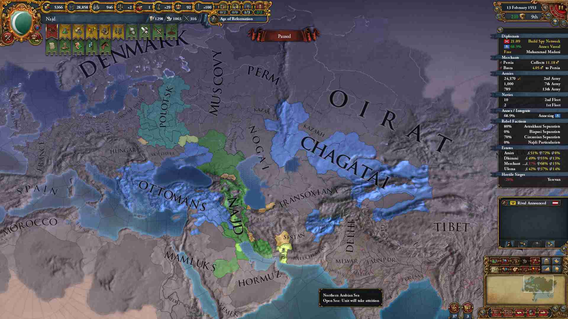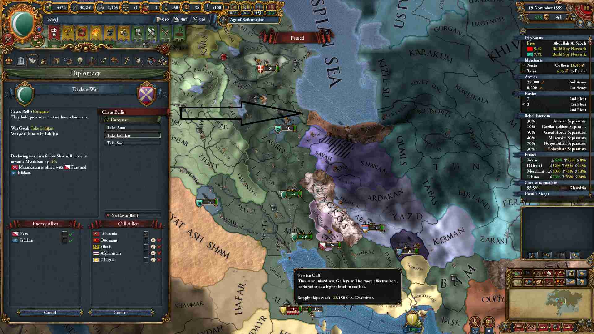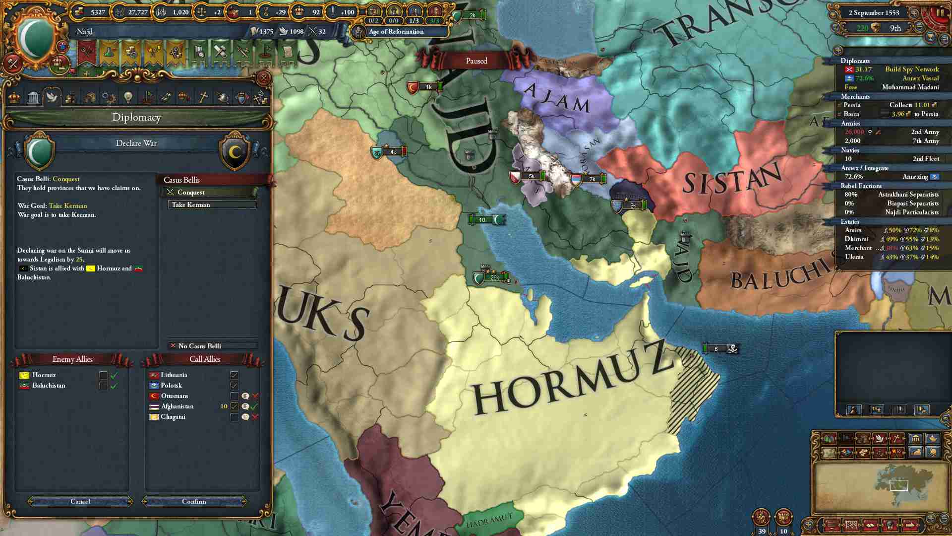 ライバルHormuzがMamluks、Transoxianaと同盟していて厄介だったため、Sistanを使って釣りだし宣戦