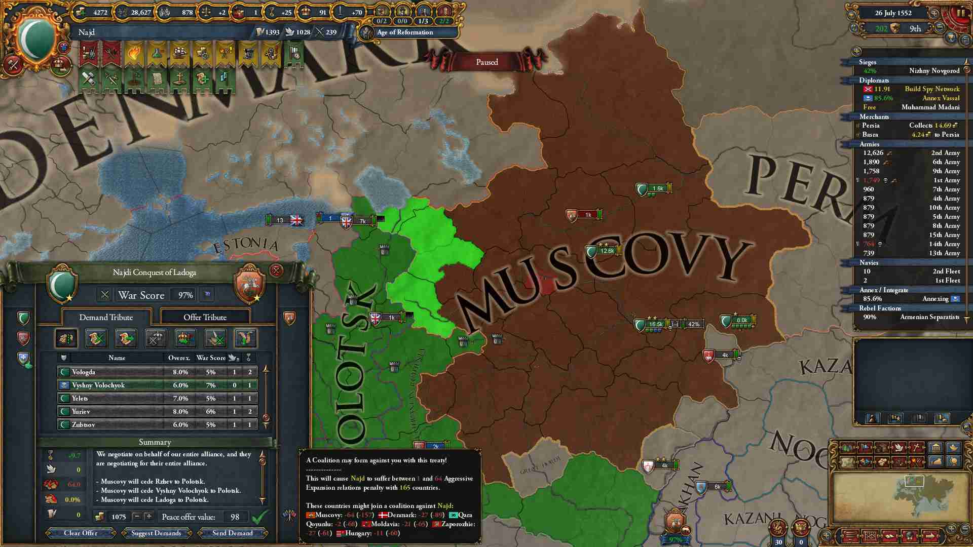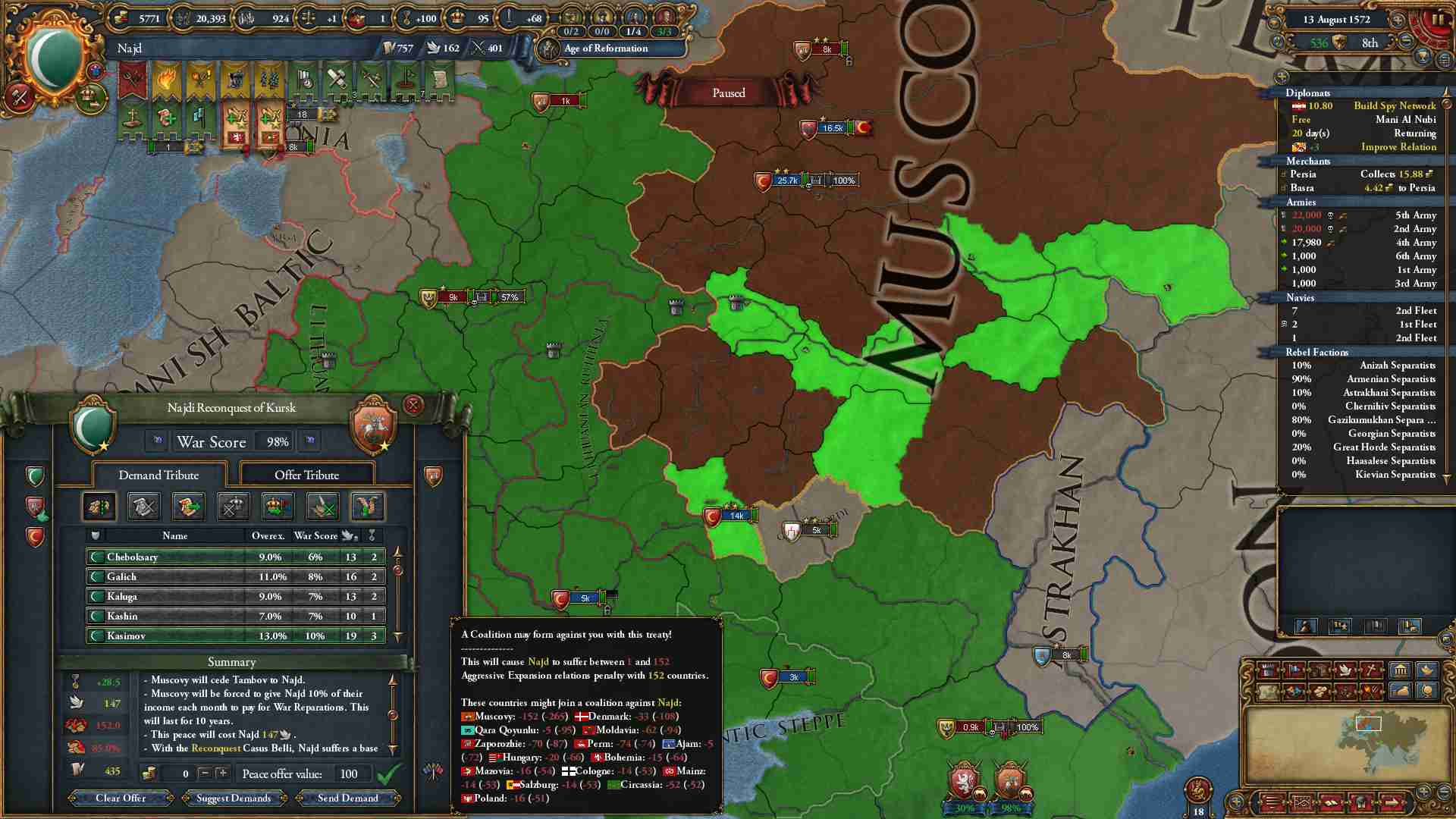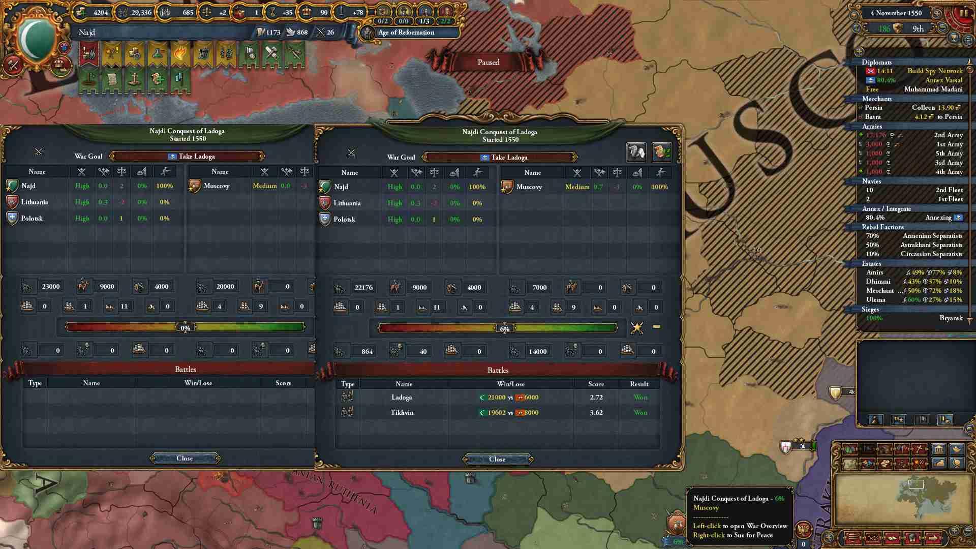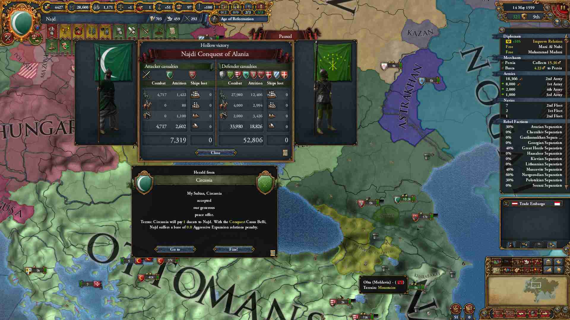 1546年9月 終戦(3州+金銭+Circassiaのライバル解除)。Great_Horde領内に沸いた部族反乱の相手が面倒だったので完全併合はしなかった