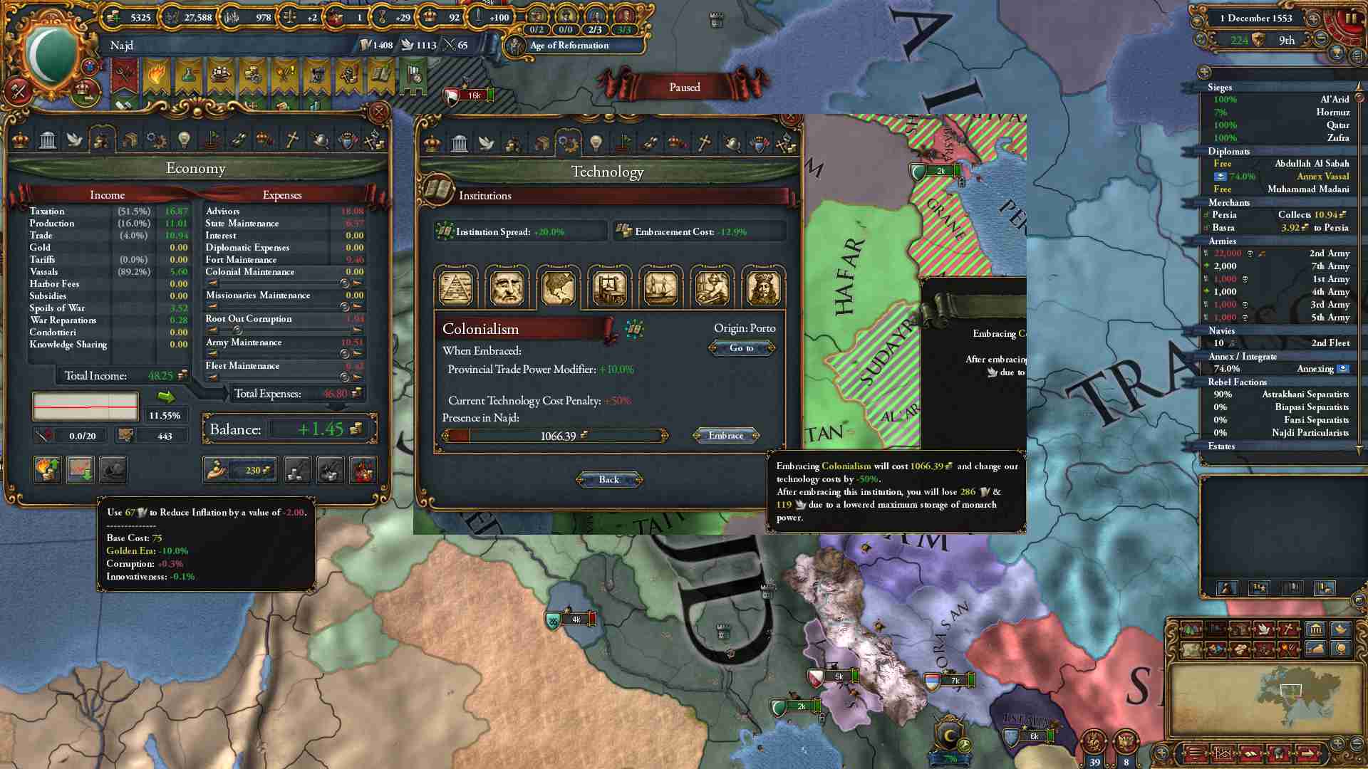 1553年12月 ようやくOttomans領から"Colonialism"が伝播→受容(統治点が溢れそうだったので、受容前にインフレ削減×2に使用)