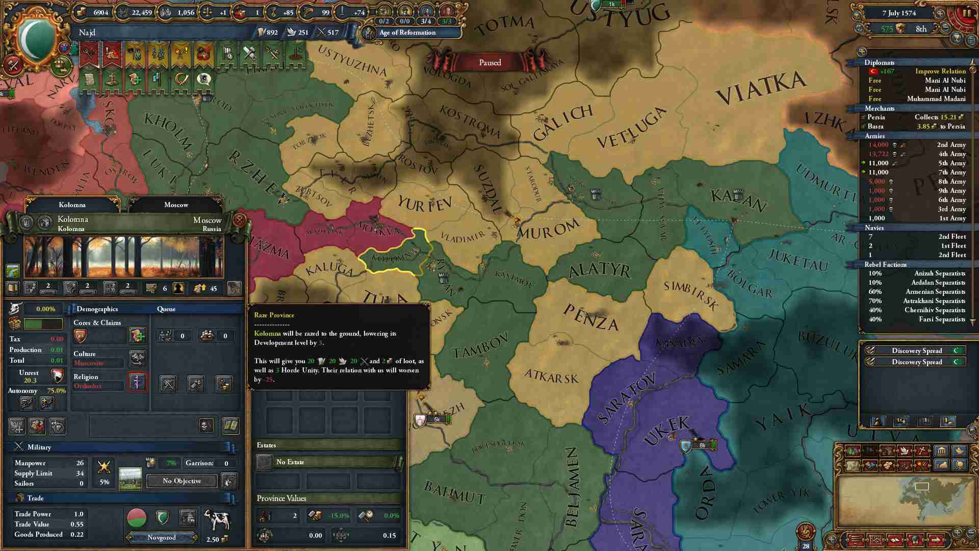 自国コアのついていない州を"Raze(完全な破壊)"できることである。この効果は凄まじく、開発度の低下と引き換えに君主点を入手できる