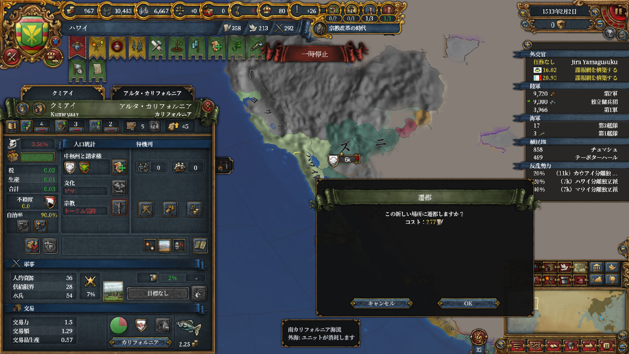 7植民地リージョンの遷都条件を満たせました。遷都先は裏で原住民殴って手に入れた土地クミアイです。1513年遷都。