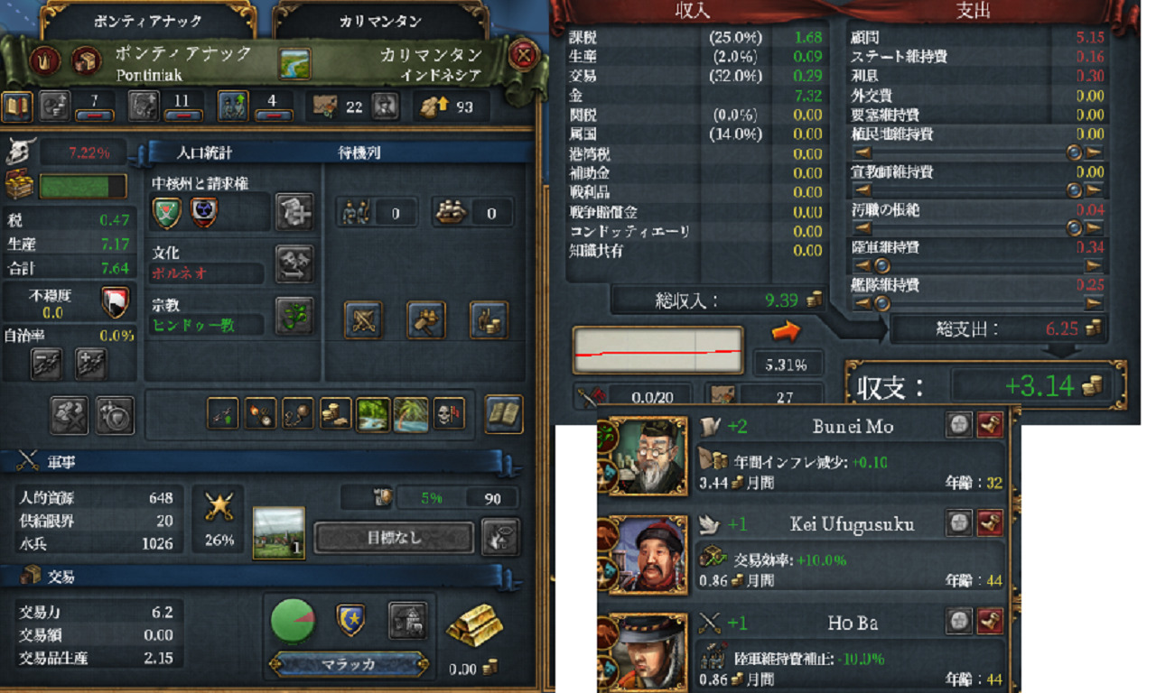 サンバスのポンティアナック州を君主点を使い開発します。従属国の土地を開発すると独立欲求が下がります。