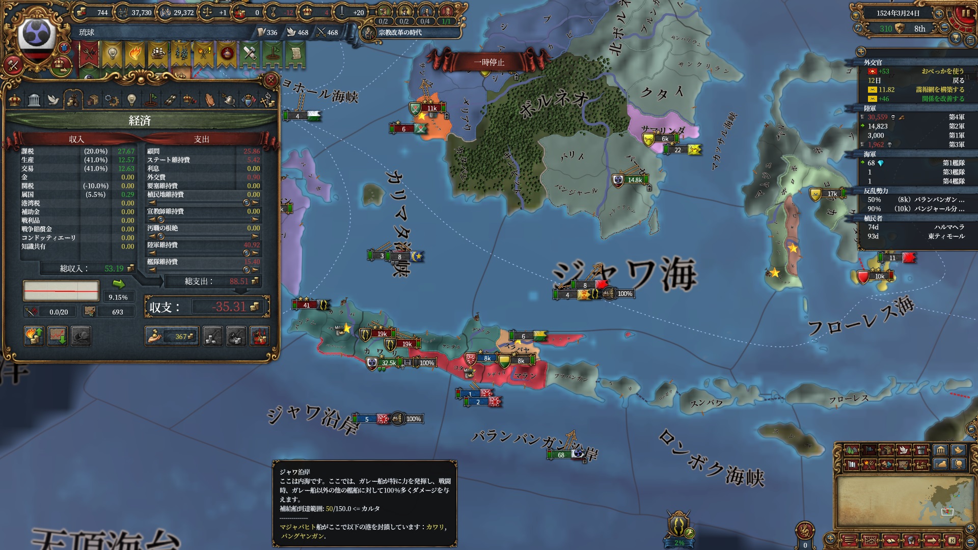 モルッカの征服状態を眺めつつ、現在の収支です。