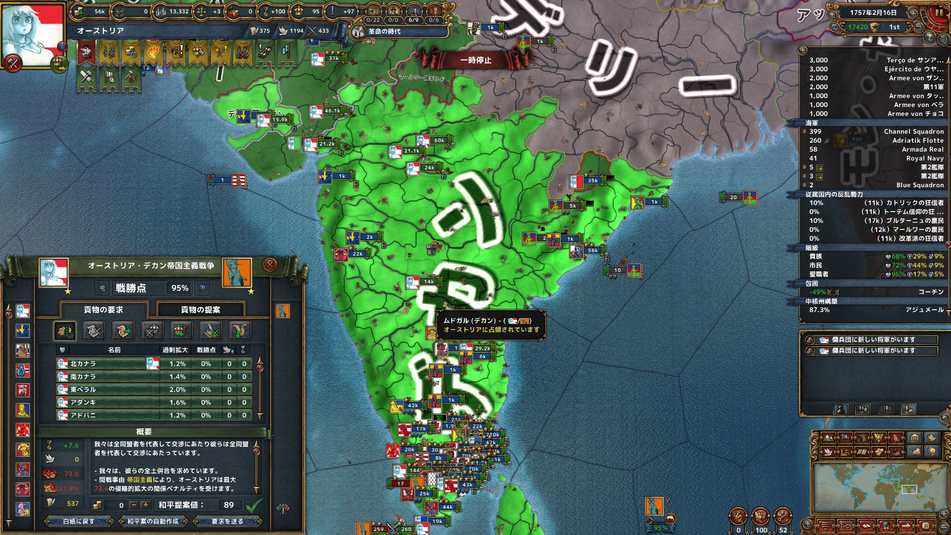 この2つの目標を達成するやり方は色々ありますが今回最終的には植民地から巻き上げてますHRE諸侯いらねえなあ