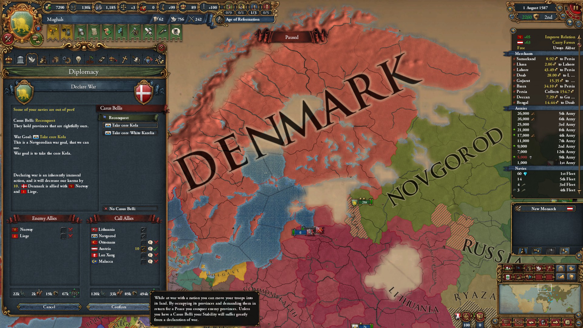 これは属国→再征服のチャンスです。オーストリアを誘ってノブゴロドの再征服CBで宣戦布告しました。