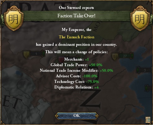官僚閥は内政に有利だが、鄭和艦隊を敵視しており、彼の海図を焼き払い、宝船を抑留している。これではいけない。私たちは世界の海を支配し続けなければならない。それも永遠に。というわけでゲーム開始から数年後におこる鄭和以後の中国の対外戦略というイベントで宦官閥を支配派閥にする選択肢を選ぼう(三つの選択肢があり、それぞれ官僚閥、寺院閥、宦官閥のどれかを支配派閥にできる)。