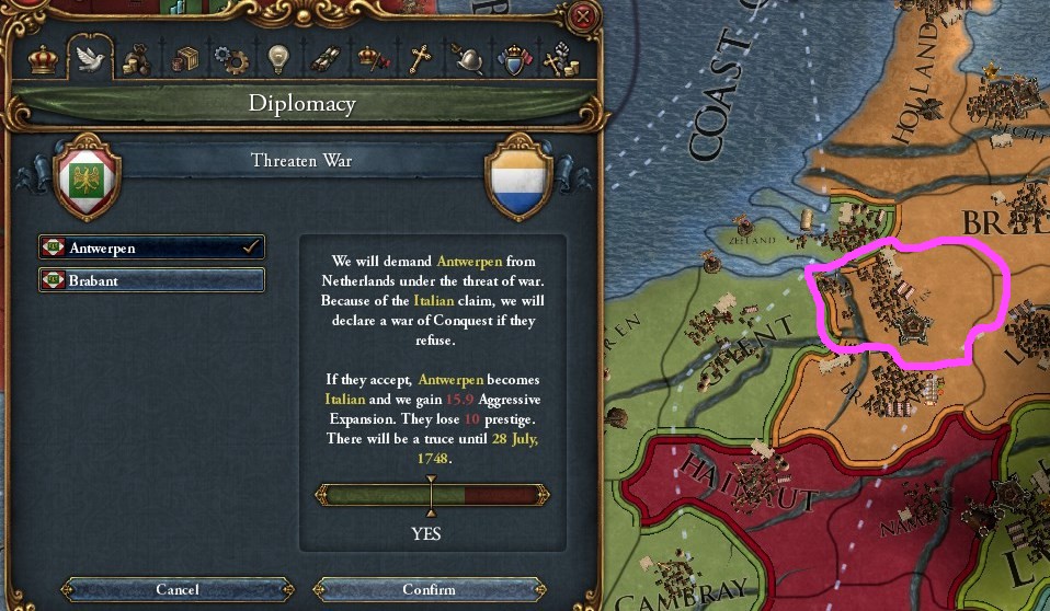 様子を見がてら、オランダからブラヴァントを恐喝。Zeelandとの陸路を確保します。