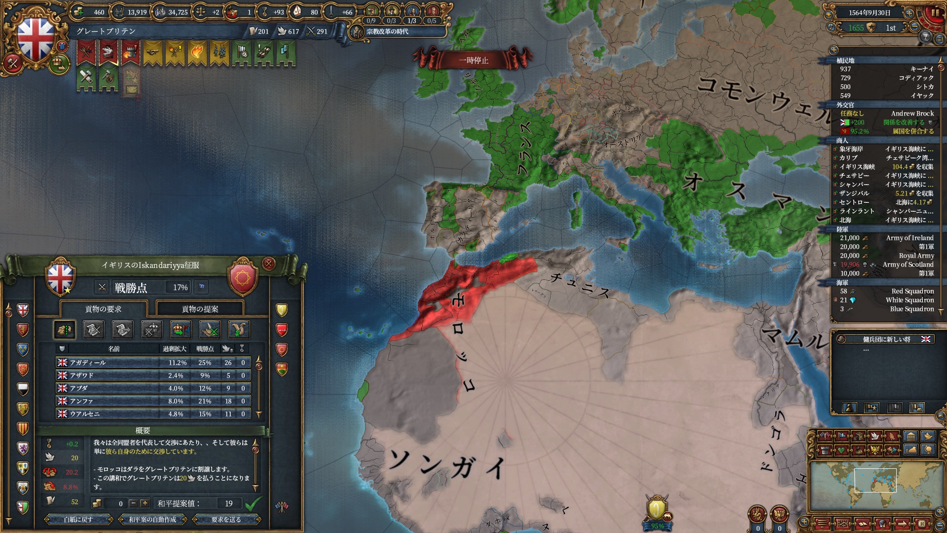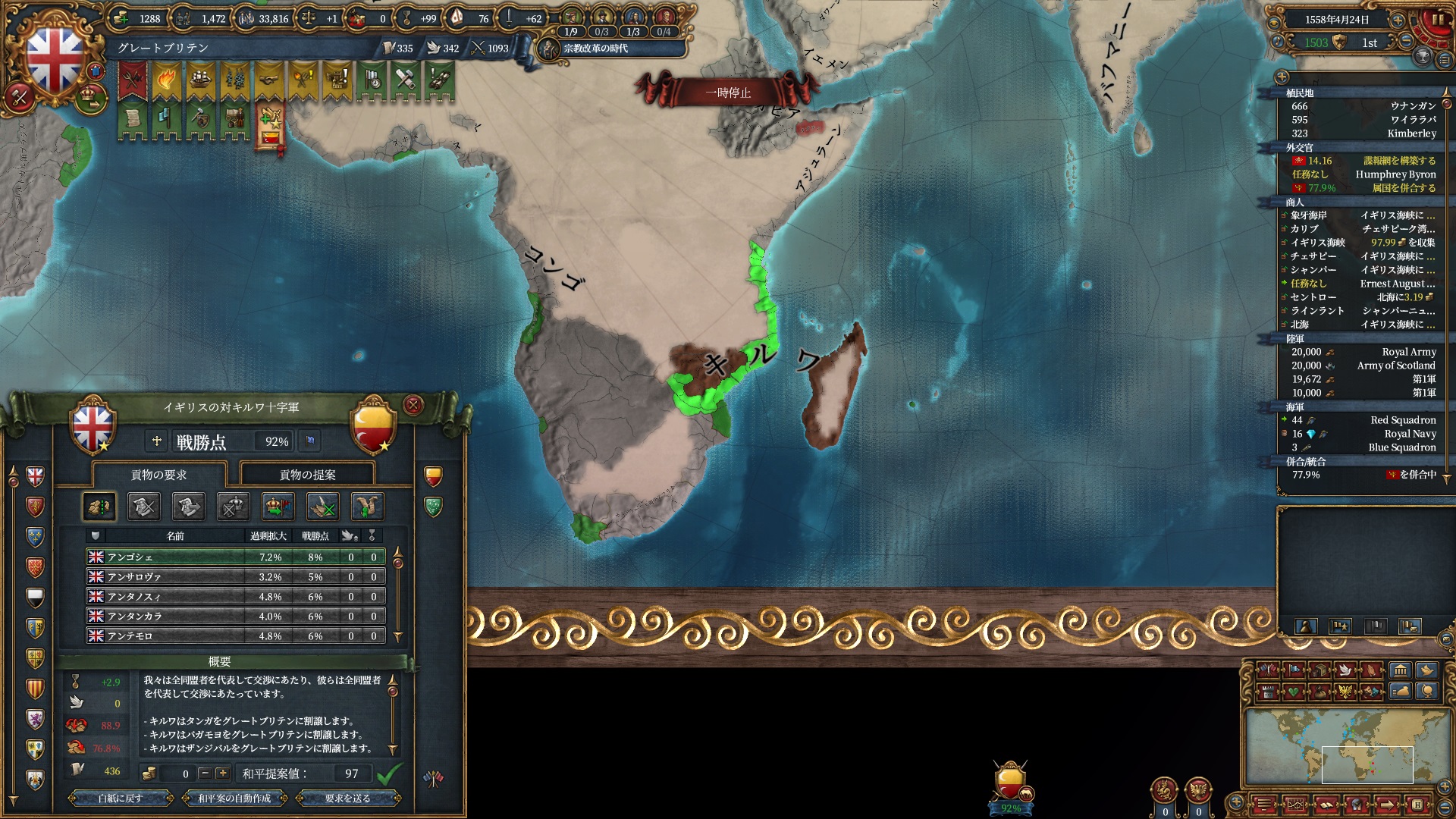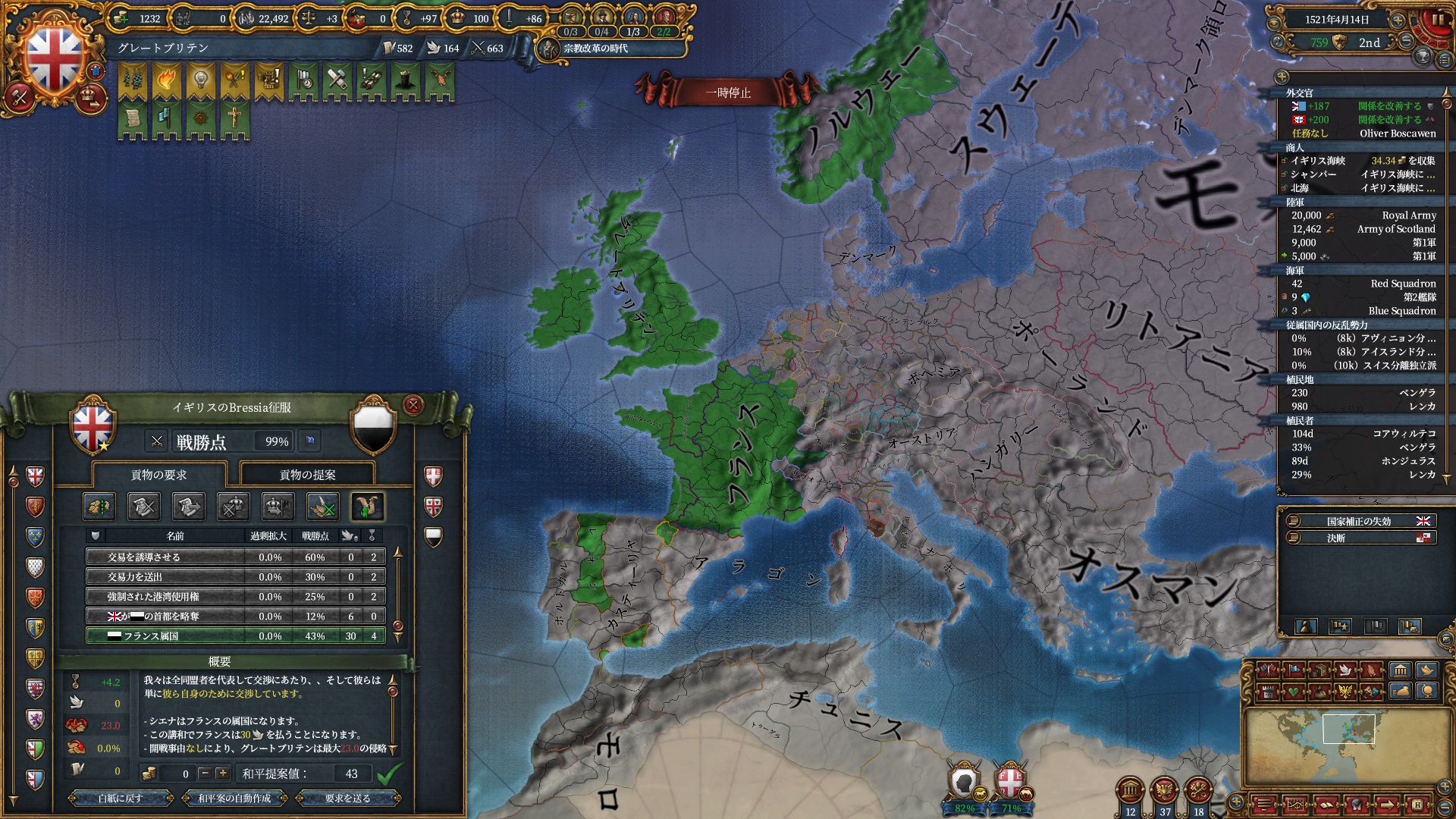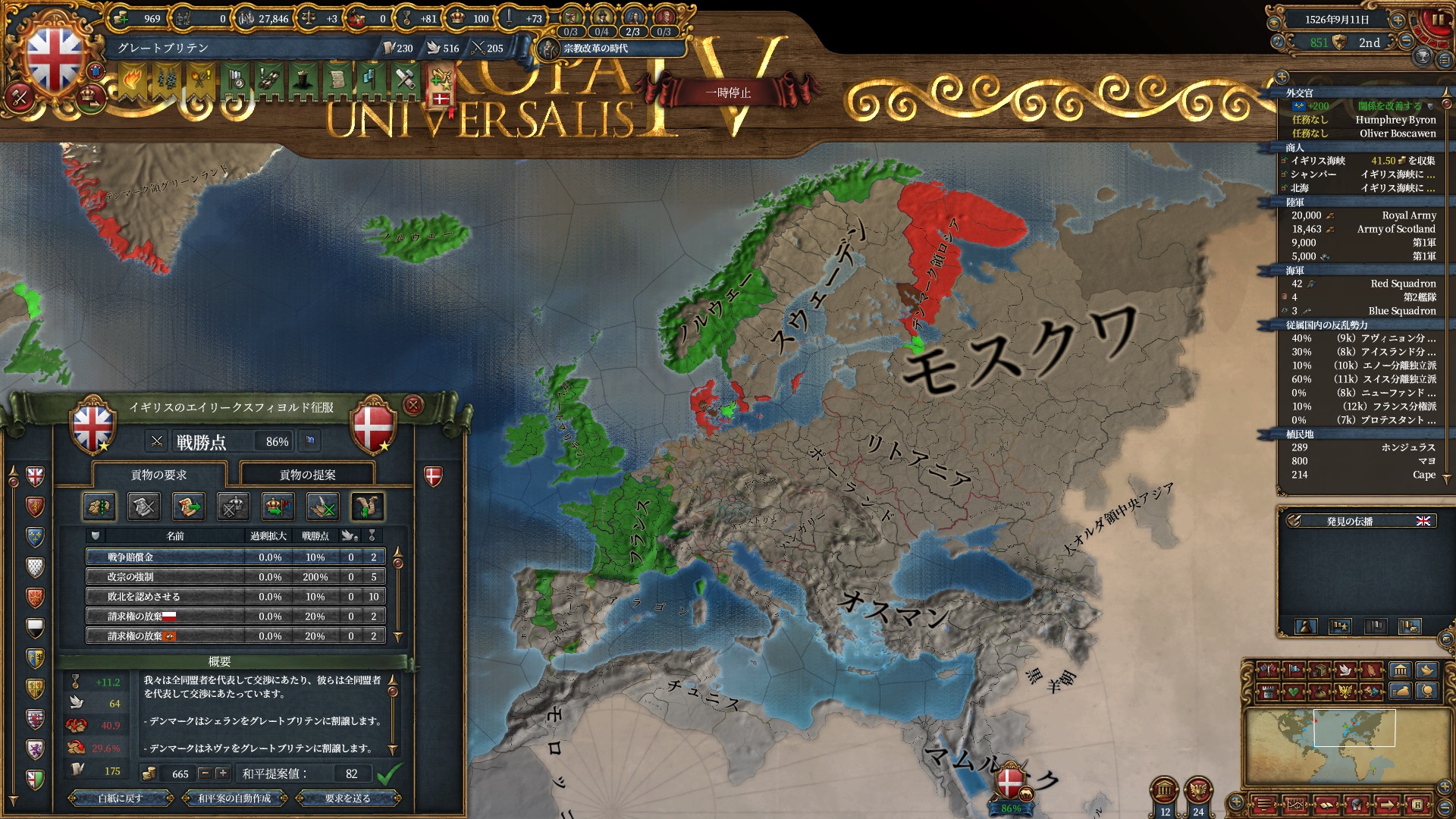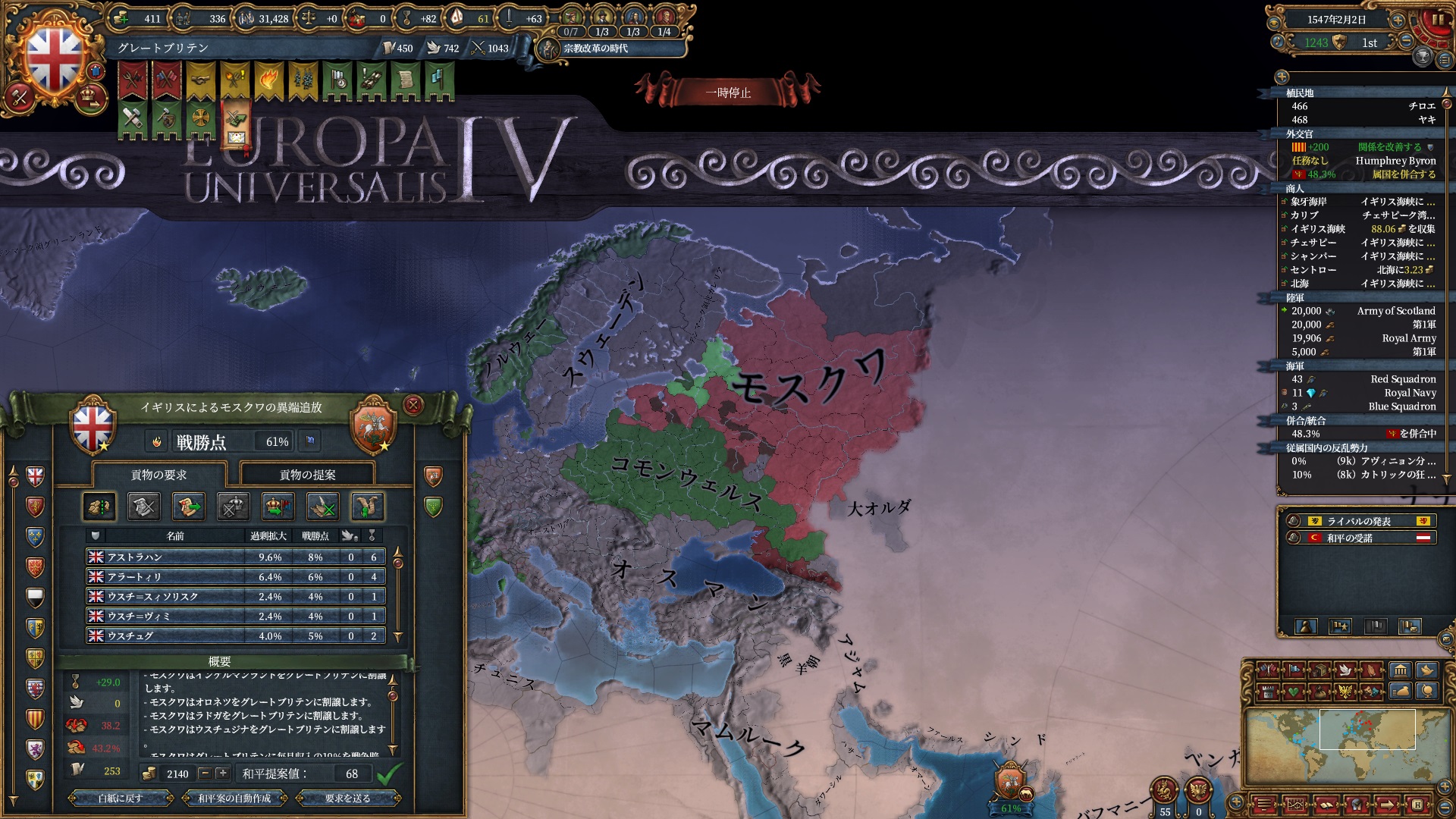戦争自体はスムーズに進んではいたのですが、評価点の関係でオスマンから同盟が切られそうになったため慌てて講和→大きなマイナス点の源となっているライバル認定されたコモンウェルスの同盟破棄としています。