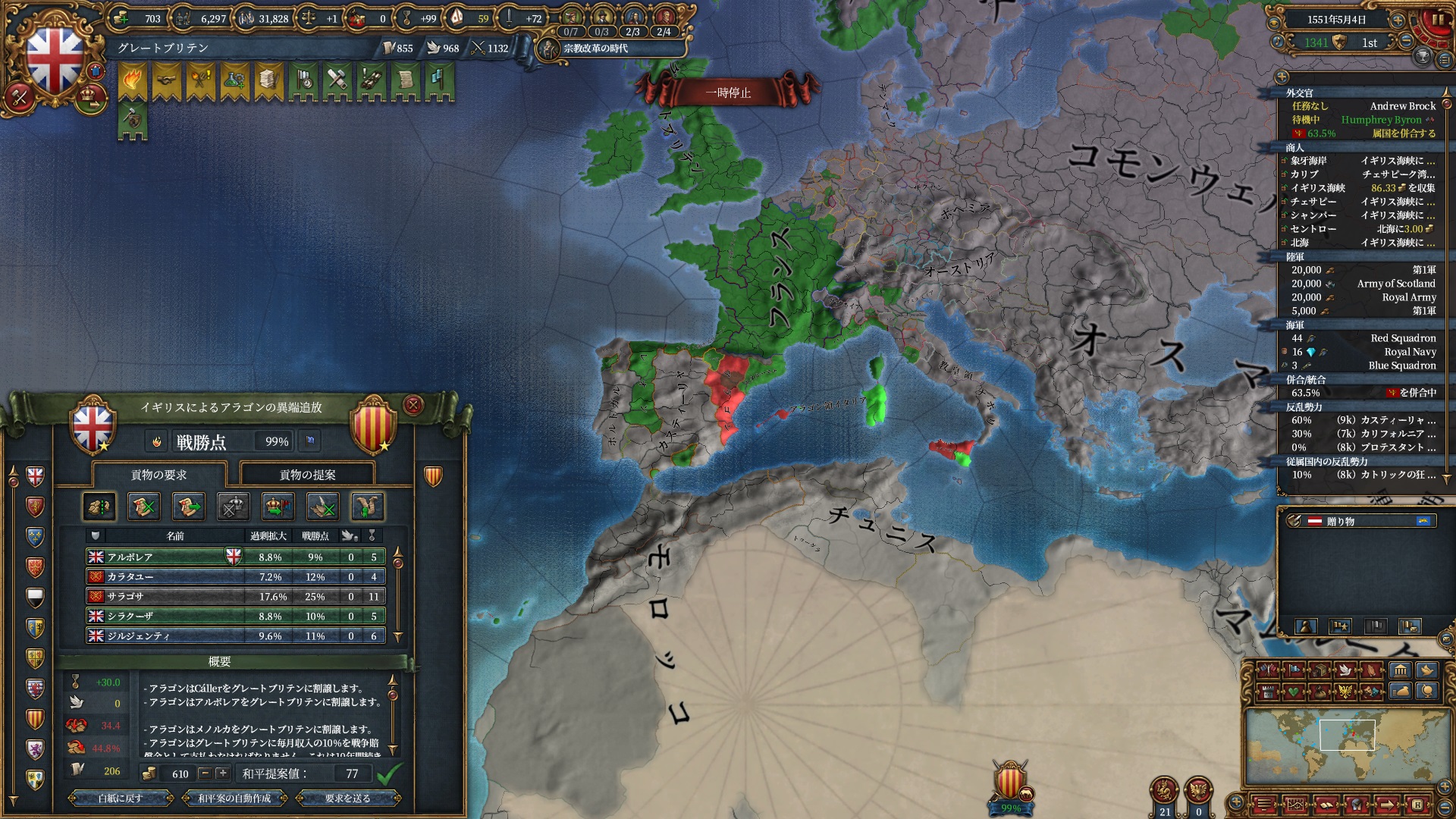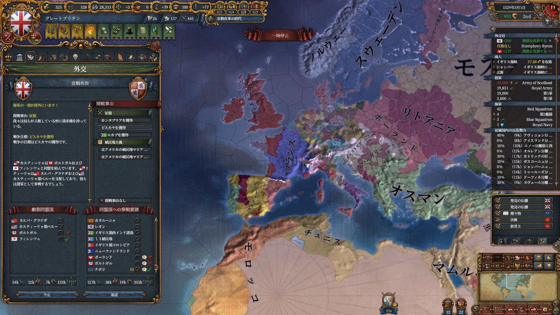 完全に消し切るまで時間がかかるカスティーリャ・ポルトガルはずっと包囲網候補として計上されるどころか、今回アラゴンまで入ってきているので欧州の拡張はなるべく無理しないようにしたいところです。
