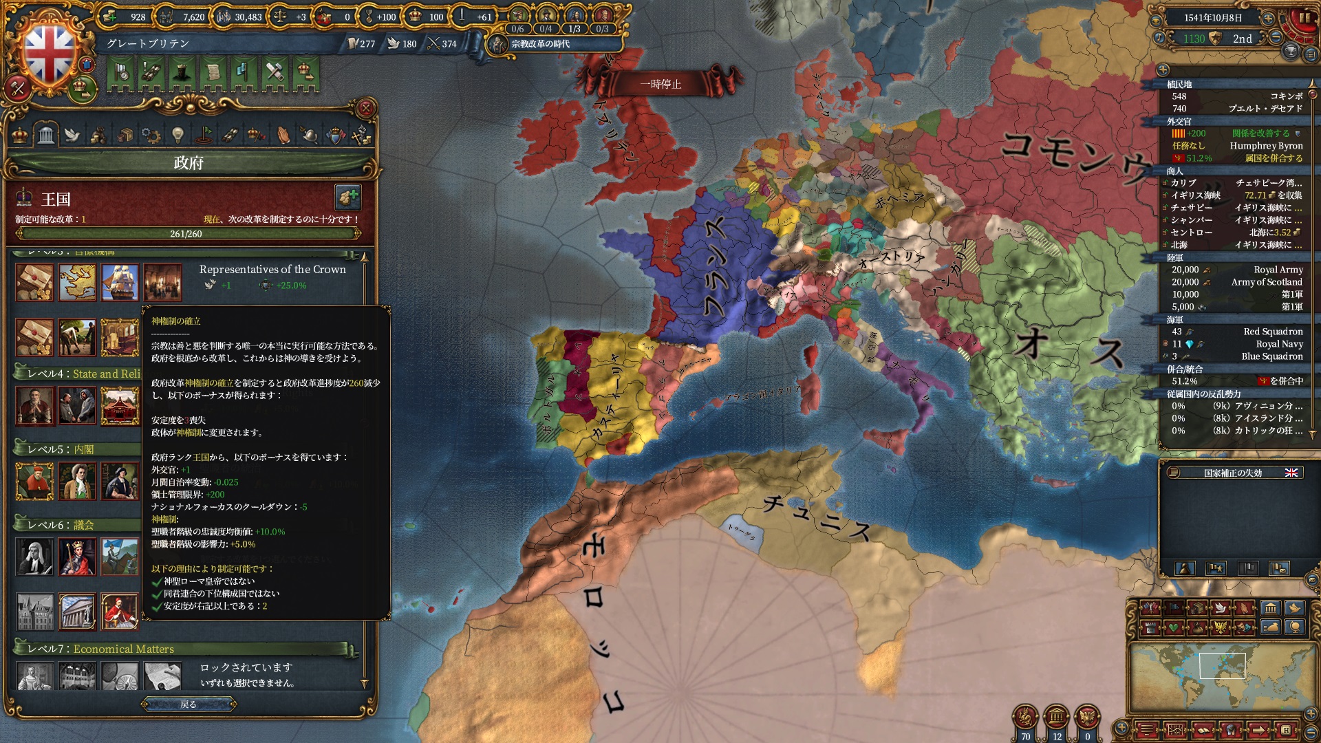 神権制になる少し先の話を含めるなら、この時期はDoF+信仰+神権制のDoF強化政府改革の補正と併せて大体2年に1回は撃てます。