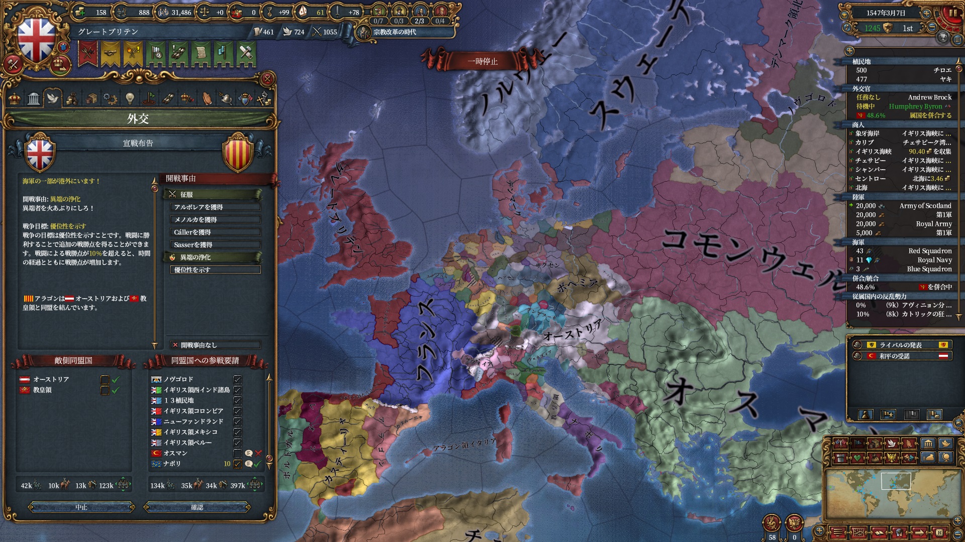 1.34では同盟の維持が難しいとか領土欲が凄いとか噂が凄いですが、どんな程か見てみようかと思います。
