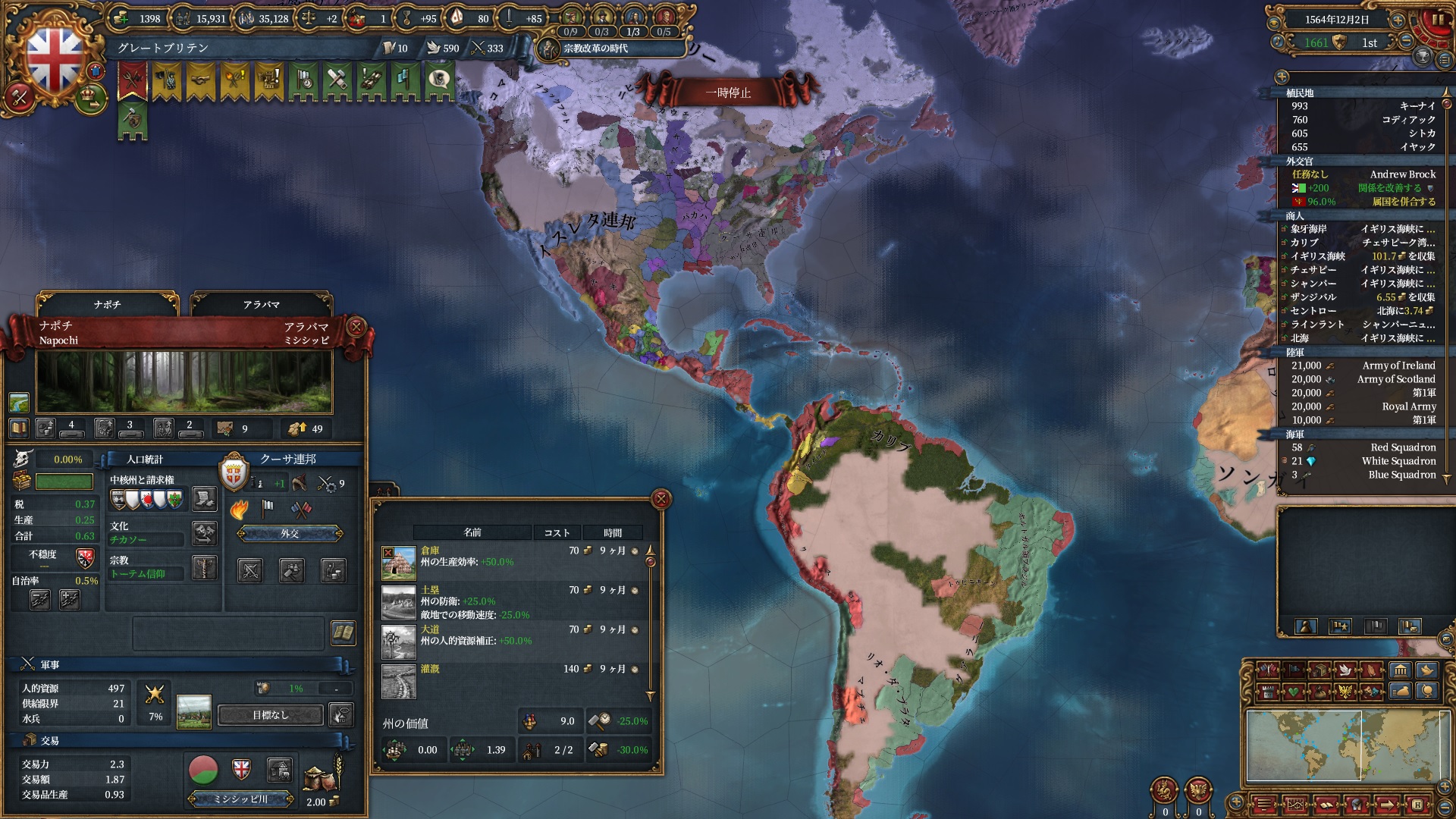早期の新大陸統一を目指すと植民地国家のLDが割と無視できないレベルになるので、探検破棄→権勢へのアイデア切り替えは早めにやっておきたいところです。