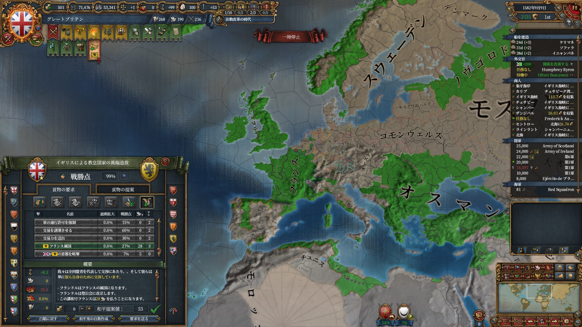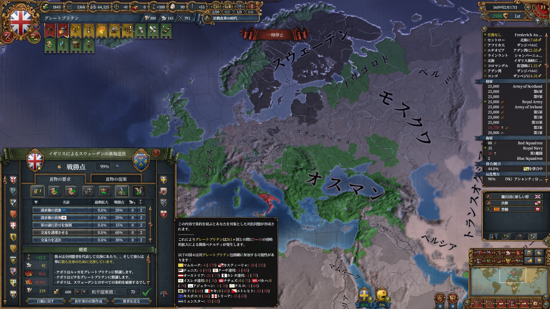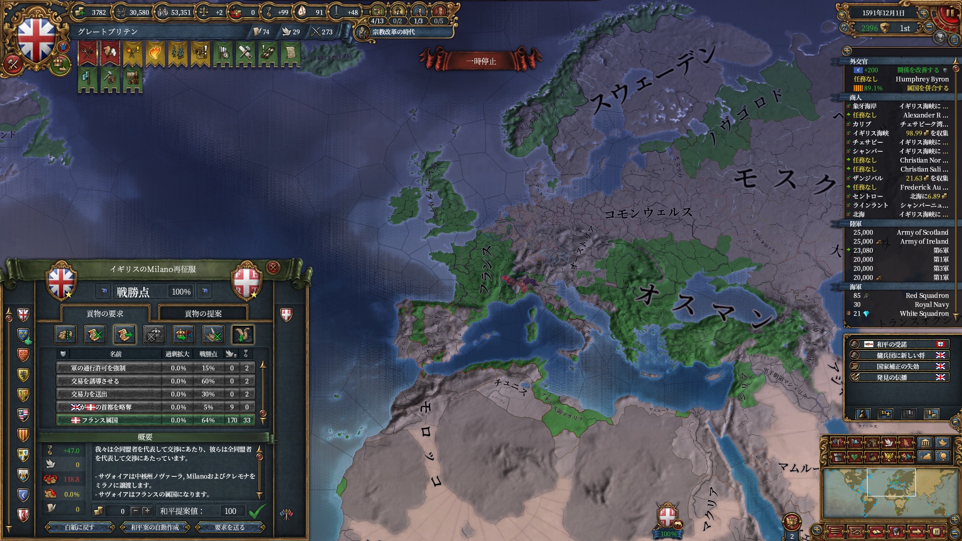 属国:フランス・カタルーニャ・レオン・ミラノ・ノヴゴロド・ノルウェー(併合中)