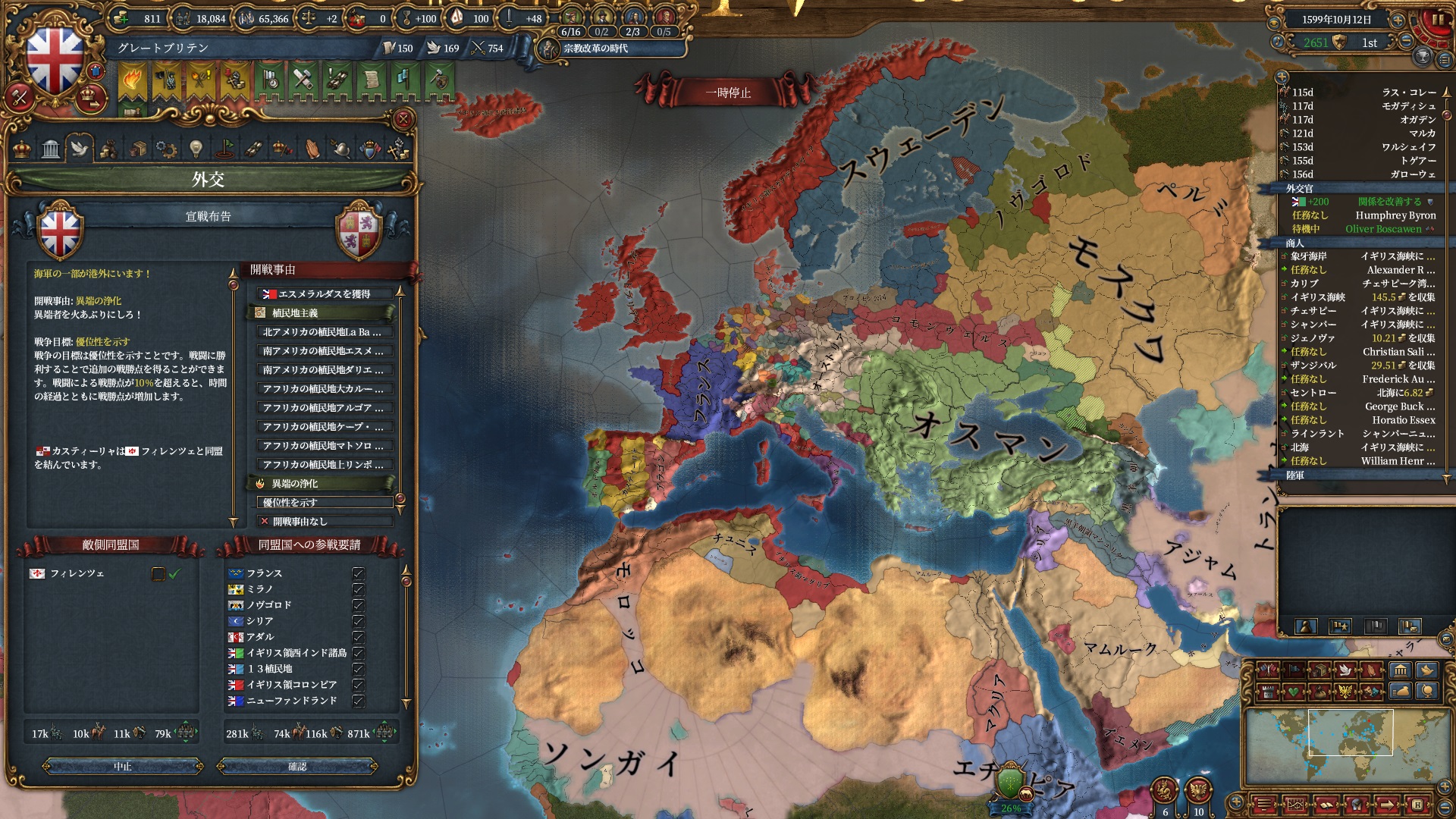 他、優先して叩いておきたい国としてはモスクワはタタール方面に広く伸びていく可能性があるのと、聖戦CBを使わない予定のマムルークは殴った時に文化グループ・宗教が一致しているオスマンにAEが飛びやすいので邪魔しておきたいぐらいです。