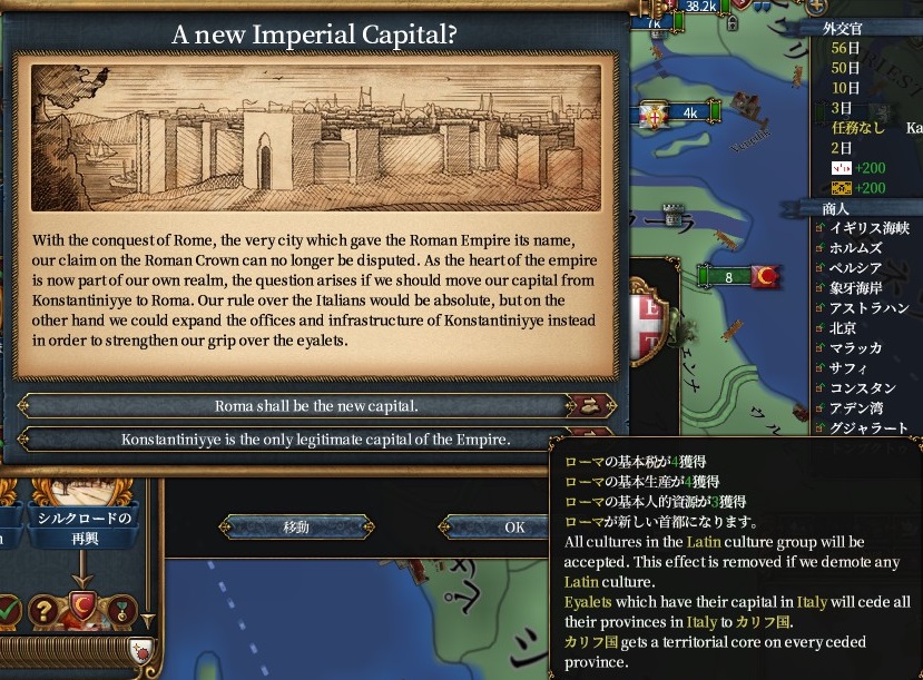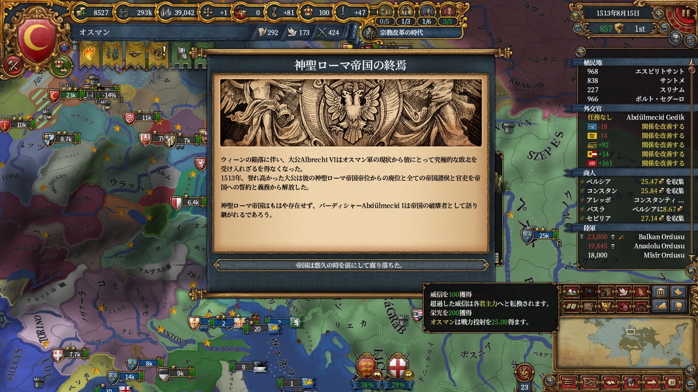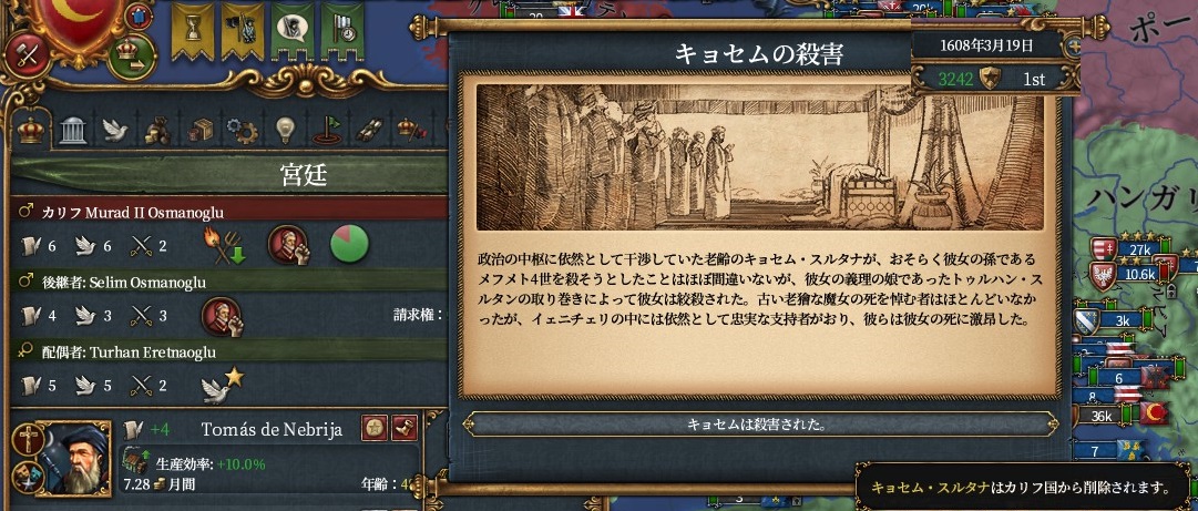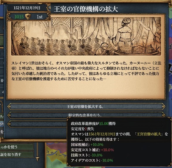 統治効率、安定度コスト減、外交併合コスト減、コアエヤレト化+20、イェニチェリ国難達成による全階級忠誠均衡+20%と影響+10%あるいは絶対主義+15も貰えます。