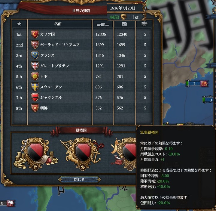 これらのミッション達成と、属国込みで開発4000以上、列強1位、覇権国などで統治効率+5%が貰えます。