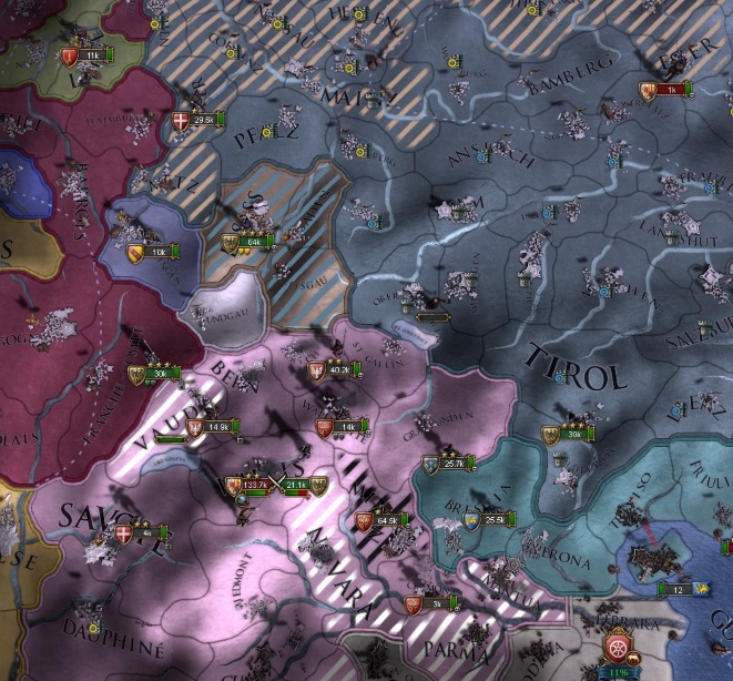 マインツ戦の最中にサヴォイが教皇領とブルゴーニュにぶん殴られて瀕死になっていました。