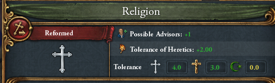改宗後、市民階級特権の「異端寛容度+2」を取っています。改革派の特徴である「異端寛容度+2」と、100の正当性により、合計の異端寛容度が+3になっています。不寛容によるプロビ出力が落ちませんので、安心して改宗していきましょう。