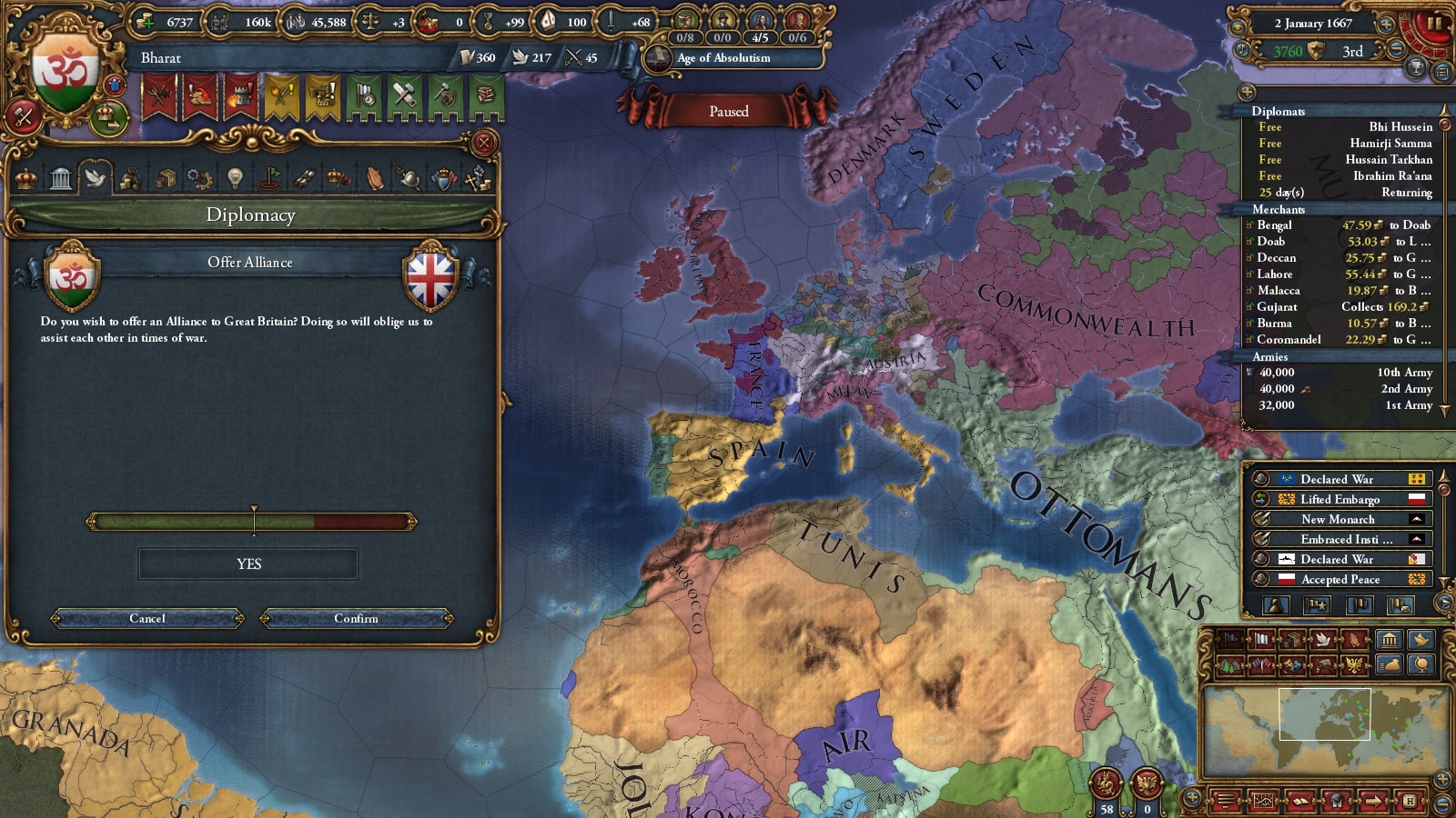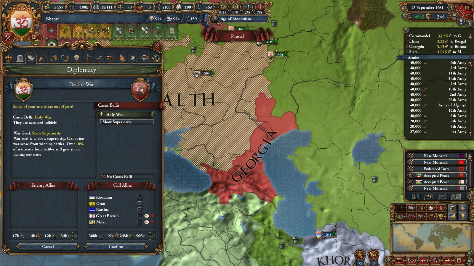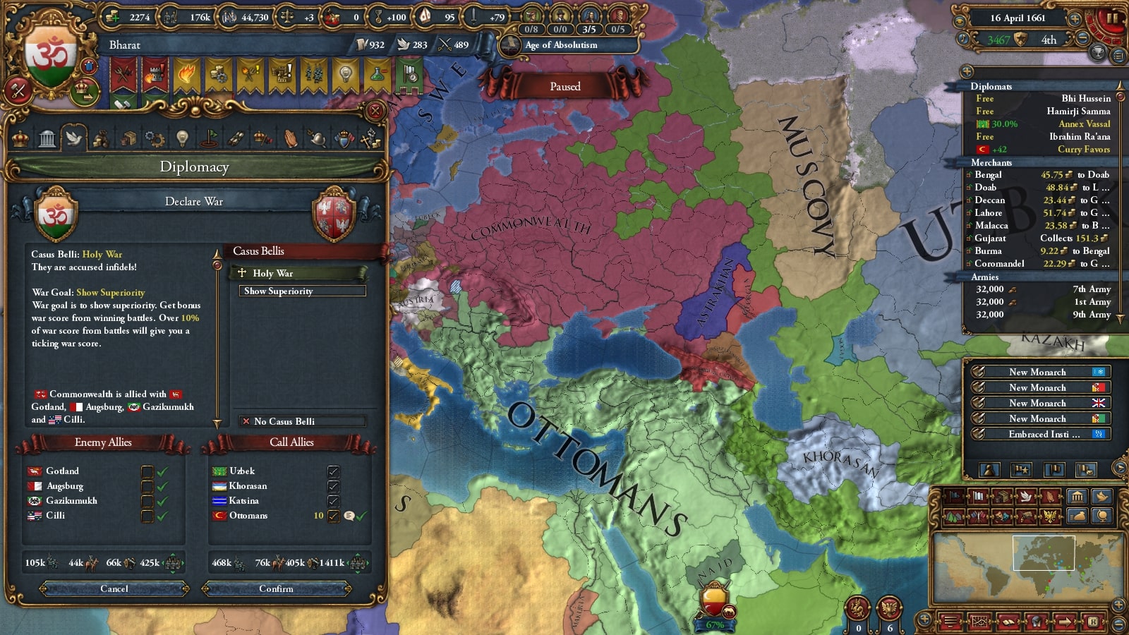 オスマン連れて第二次コモンウェルス戦です。敵同盟国で厄介なのは50k出してくるアウクスブルク/Augsburgくらい、余裕でしょう。