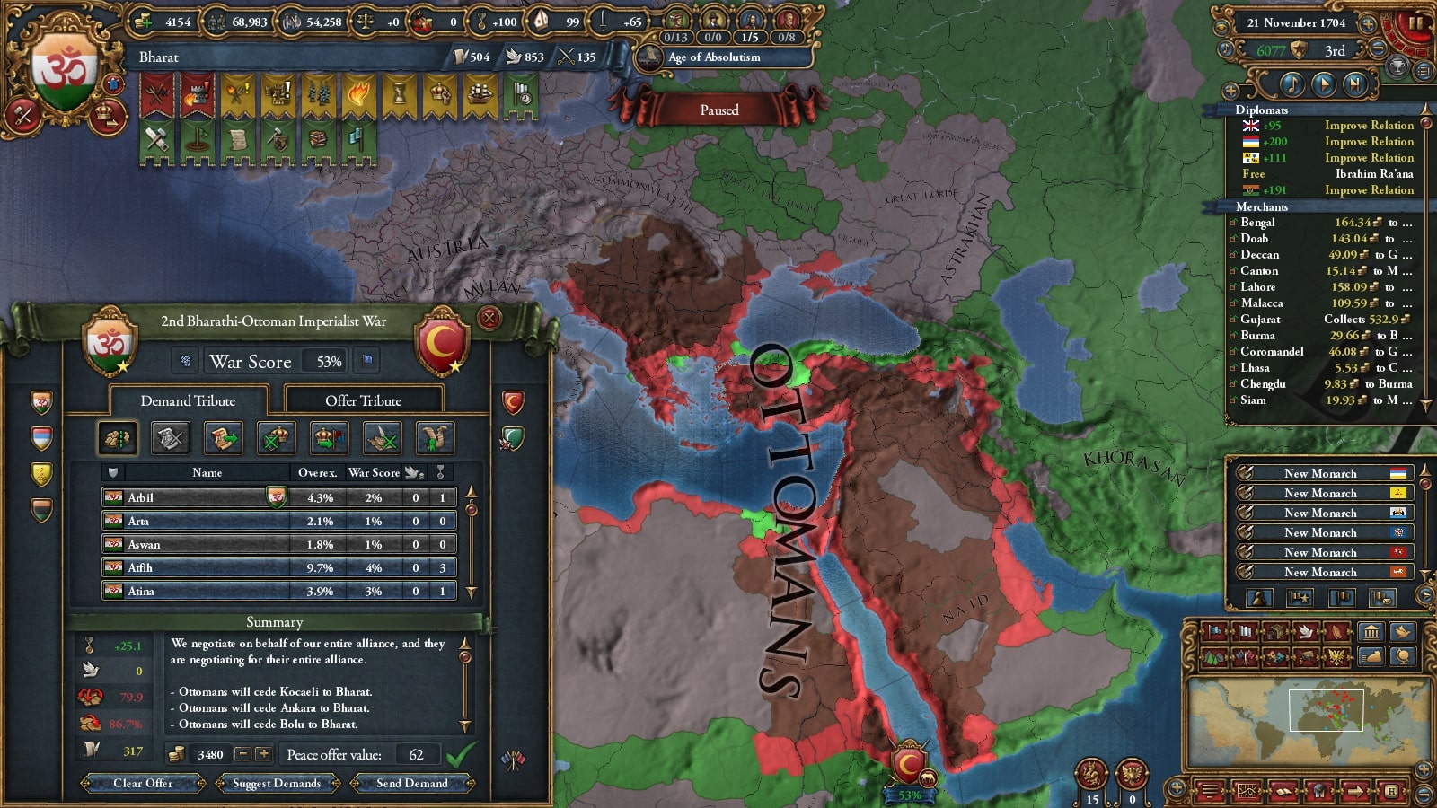列強の他メンバーはトップだったオスマンを抑えたことで他は制御可能ですかね。神権パワーを信じましょう。