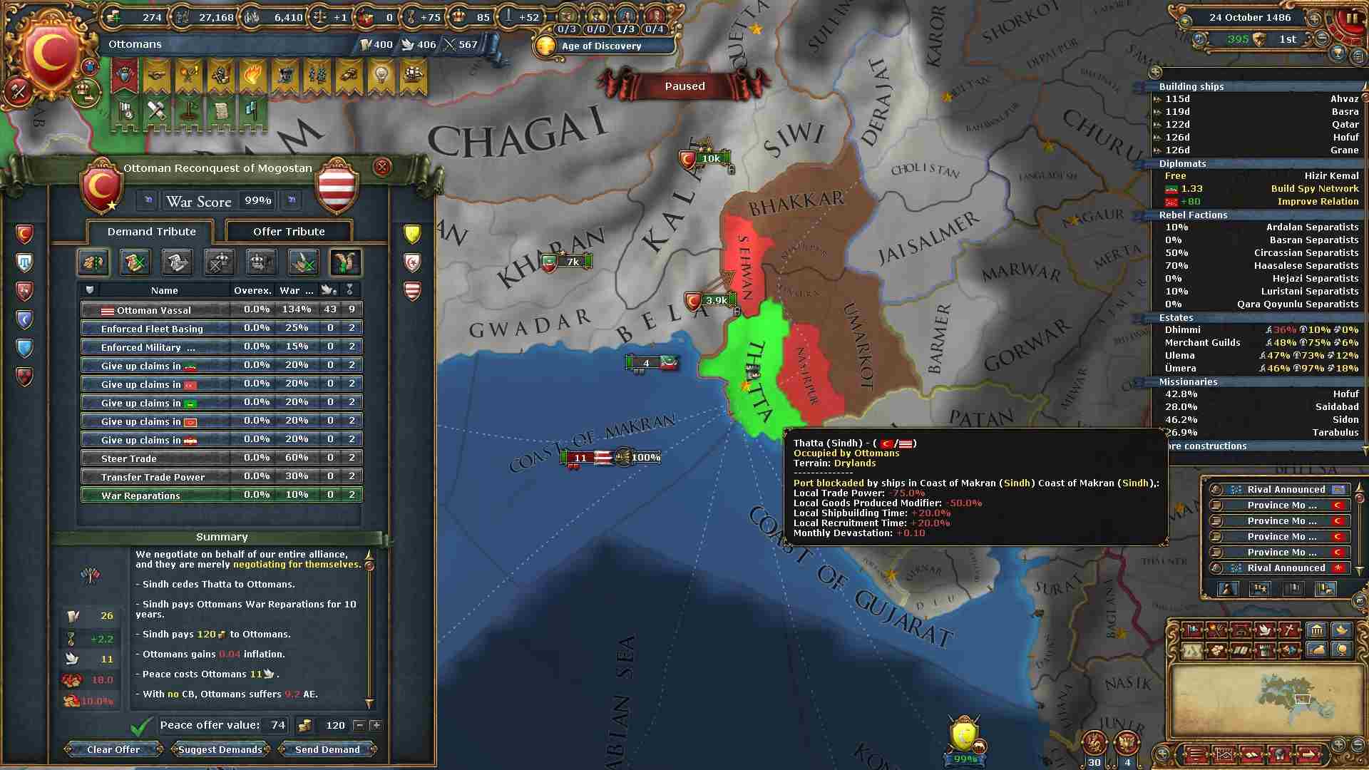 ホルムズの同盟国として参戦してきたシンドから「Unify Islam」に必要な州タッタを割譲させました。