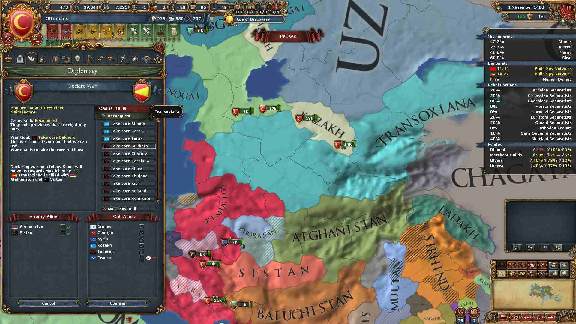 今回は戦勝点MAXで旧ティムール領及びカザフ領を返還させます。