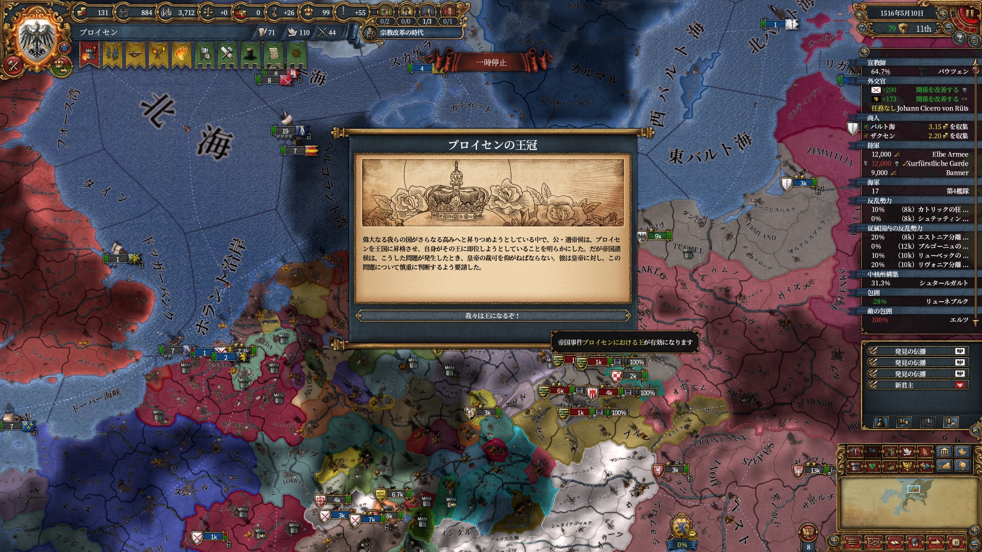 そもそもHRE選帝侯は自力で王国までは昇格出来るため自身でプロイセンを形成する頃に自然になれている事が多いです。