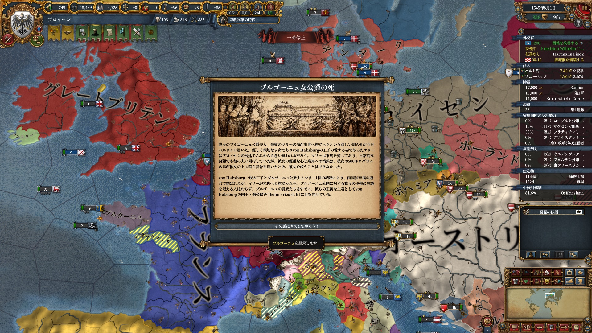 反面ブルゴーニュ継承の国力増加は大きく、ブランデンブルクdev350程に対してブルゴーニュもdev300ぐらいあるというのは中小国スタートとしてはありえないくらいのパワーアップです。