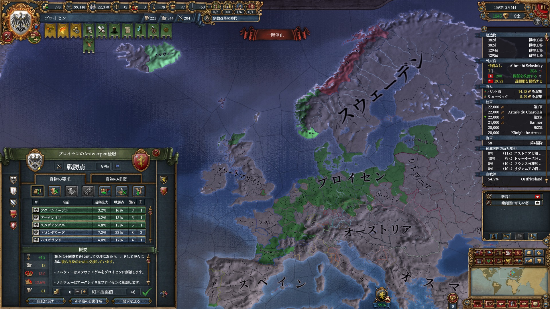 30年戦争中は個別和平も結構苦労しますが頑張って1国ずつ減らしていきます。