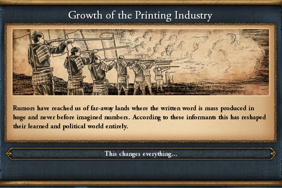 噂では幕府は活版印刷の受容に必要な資金を得るため2国を侵略したとの事であるが真偽は定かではない。