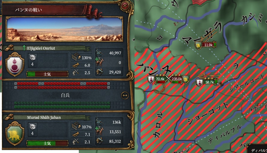 3度目のムガル戦、開戦から16か月で95点和平です。今度は先ほどみたいなクソのようなミスせずきれいに戦えました