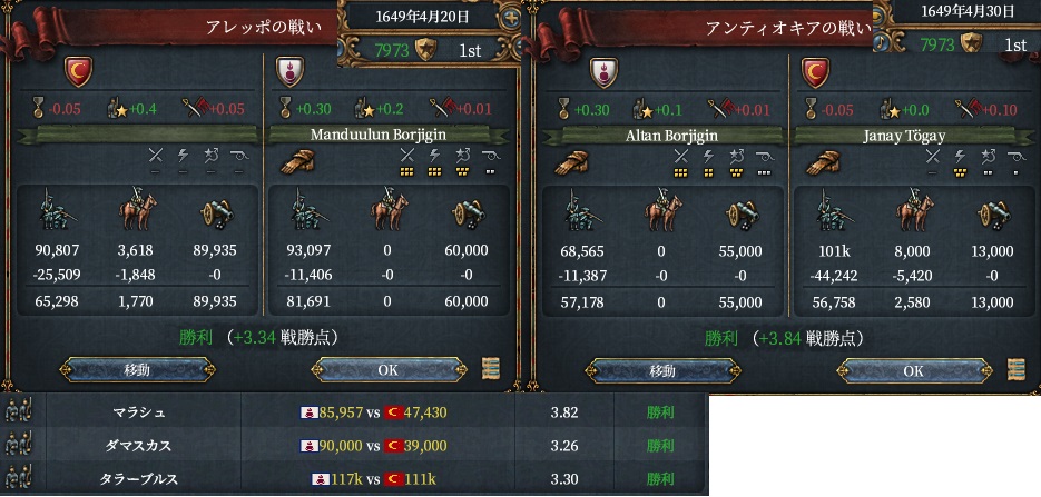 規律を140まで上げてその期間のうちに2位~4位に致命傷を与えることが狙いだったのですが、、まだイベントは発動しておらず結果オスマンには規律130で立ち向かいます