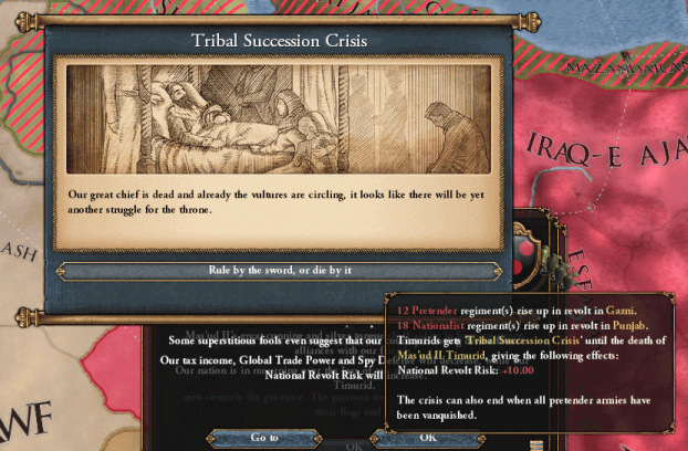 toki.png 通りがかったので説明させてもらうと、遊牧民国家では、君主の死亡時にこうした反乱イベントが生じうる。反乱を抑えきれなかった場合、ほぼ「詰み」だ。