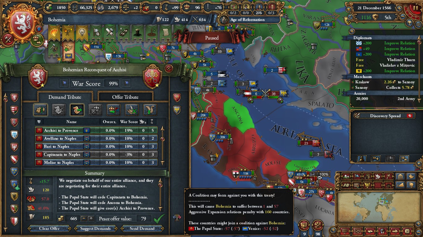 またオーストリアの有限外交コスト減の報酬に関しては、国家変態を繰り返す作業で多くの属国を併合しなければならなかったため、もともとのボヘミアの報酬やアイデア・ポリシーのスタックで-105%まで積み上げ最小の外交点の消費で済んだのでとてもありがたかった。