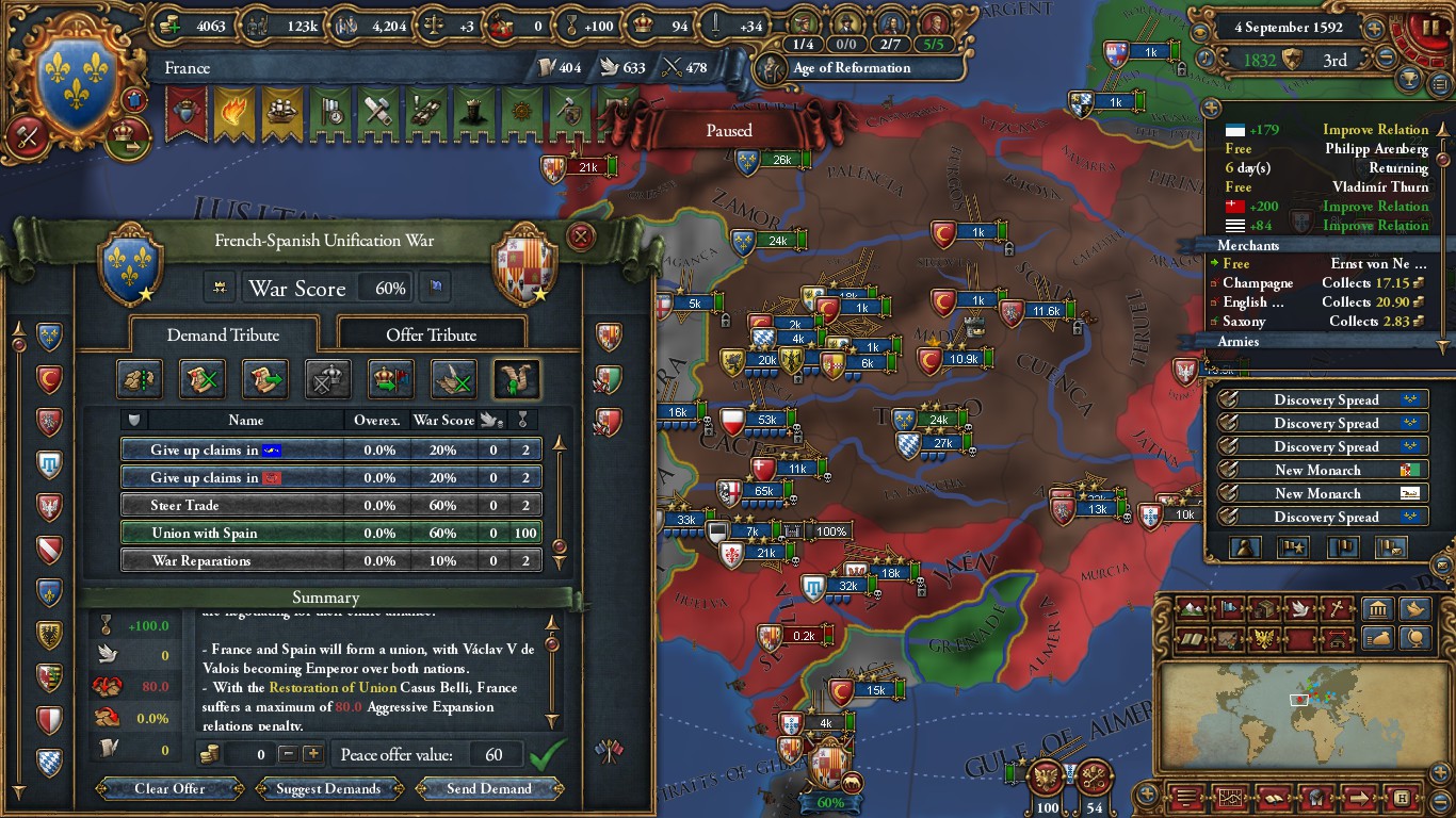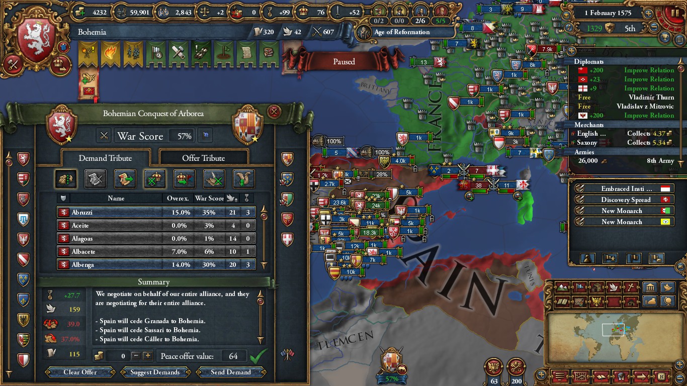 各君主点の総量は統治725,外交1175,軍事675で2575も得た。