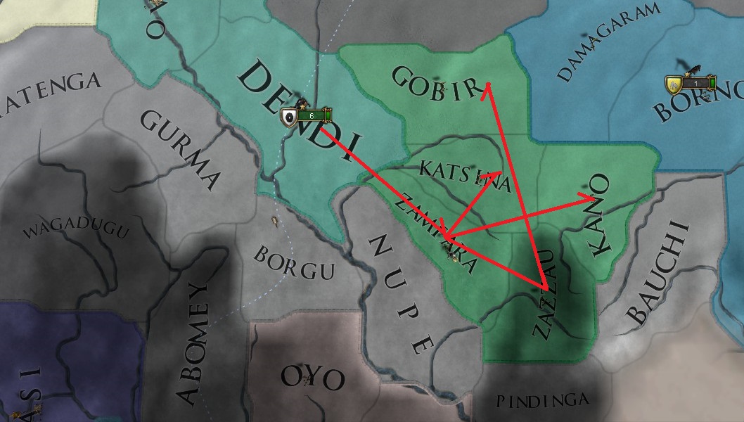 ソンガイ帝国東部の地域であるデンディは約90%は砂漠地帯であり、人々はサハラ砂漠からの浸食に常に悩まされながら、ほんのわずかにあるステップで牛を飼い暮らしてきた。デンディから東にほんの少し行けば、ハウサ諸国領ザンファラに辿り着く。ザンファラは、地域の約65%がステップであり牛の餌にはことかかず、デンディの民からすると夢のような地域であった。国境など曖昧な時代のことである。デンディの民はザンファラにたびたび入り放牧を行うようになり、1446年、ついに領有権を主張するようになった。