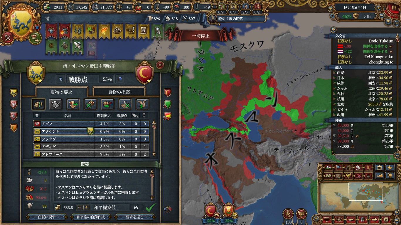 宮廷と国難を終え、清に変態し終えたのでミッションの請求権を利用してチャガタイ、朝鮮、東南アジアに侵攻していきます。