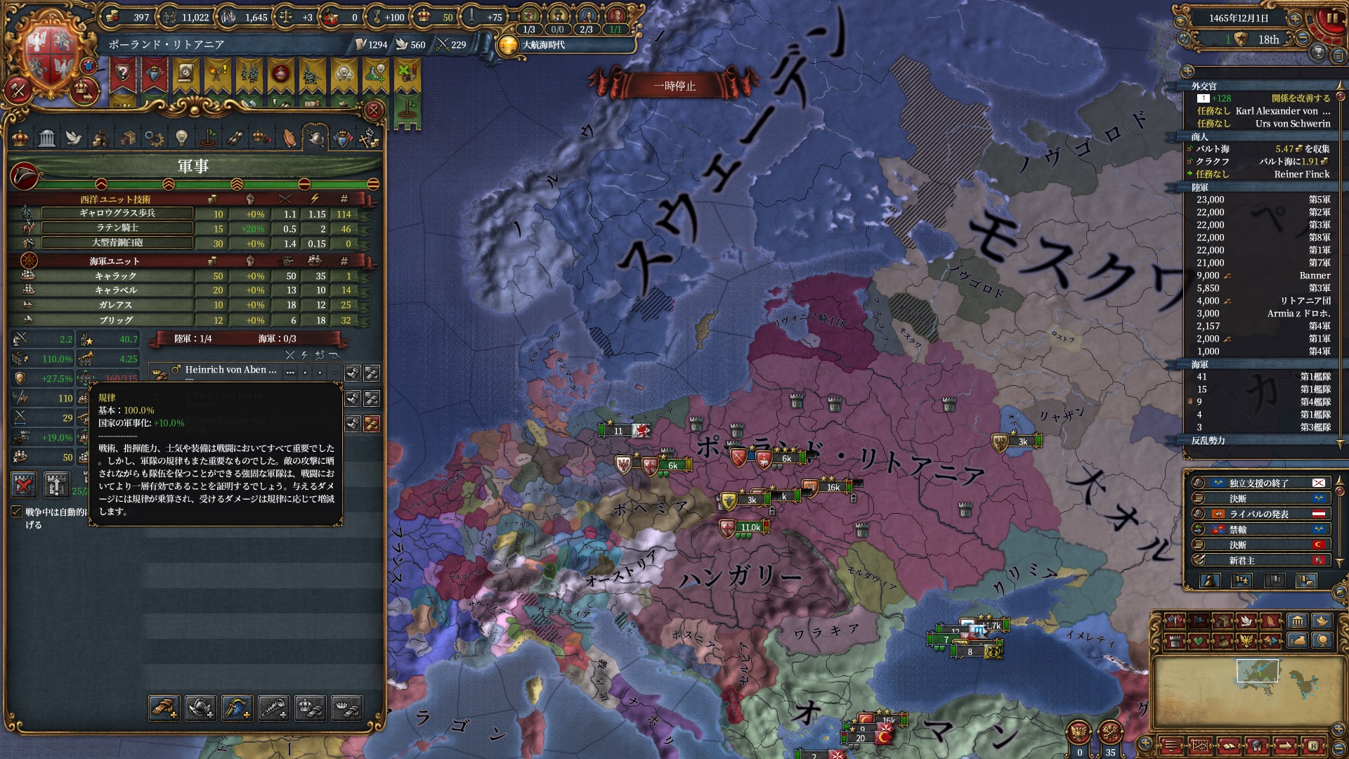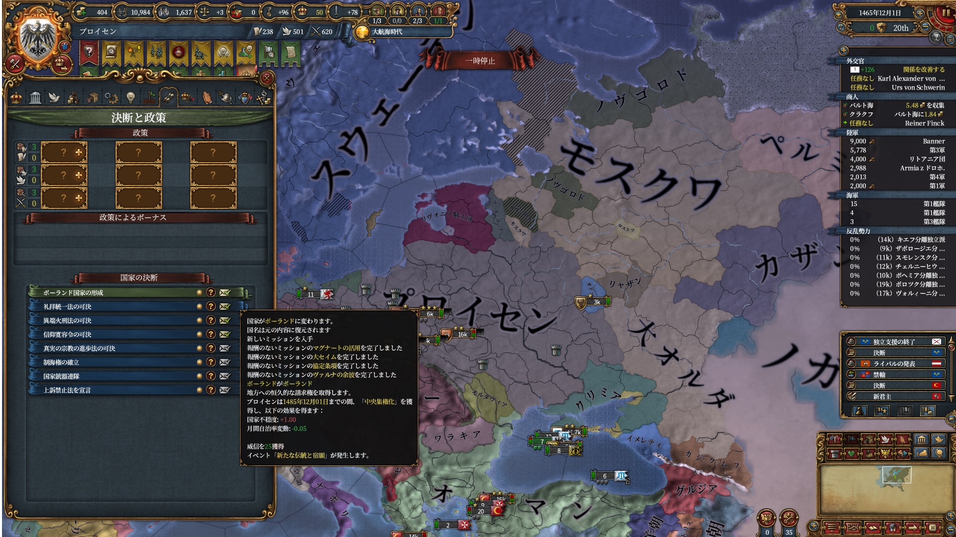 よって、ここから更にポーランド→コモンウェルスと変態していくことで、プロイセン君主制と騎兵比率100%をスマートに両立できる(はず)といった筋書きです。