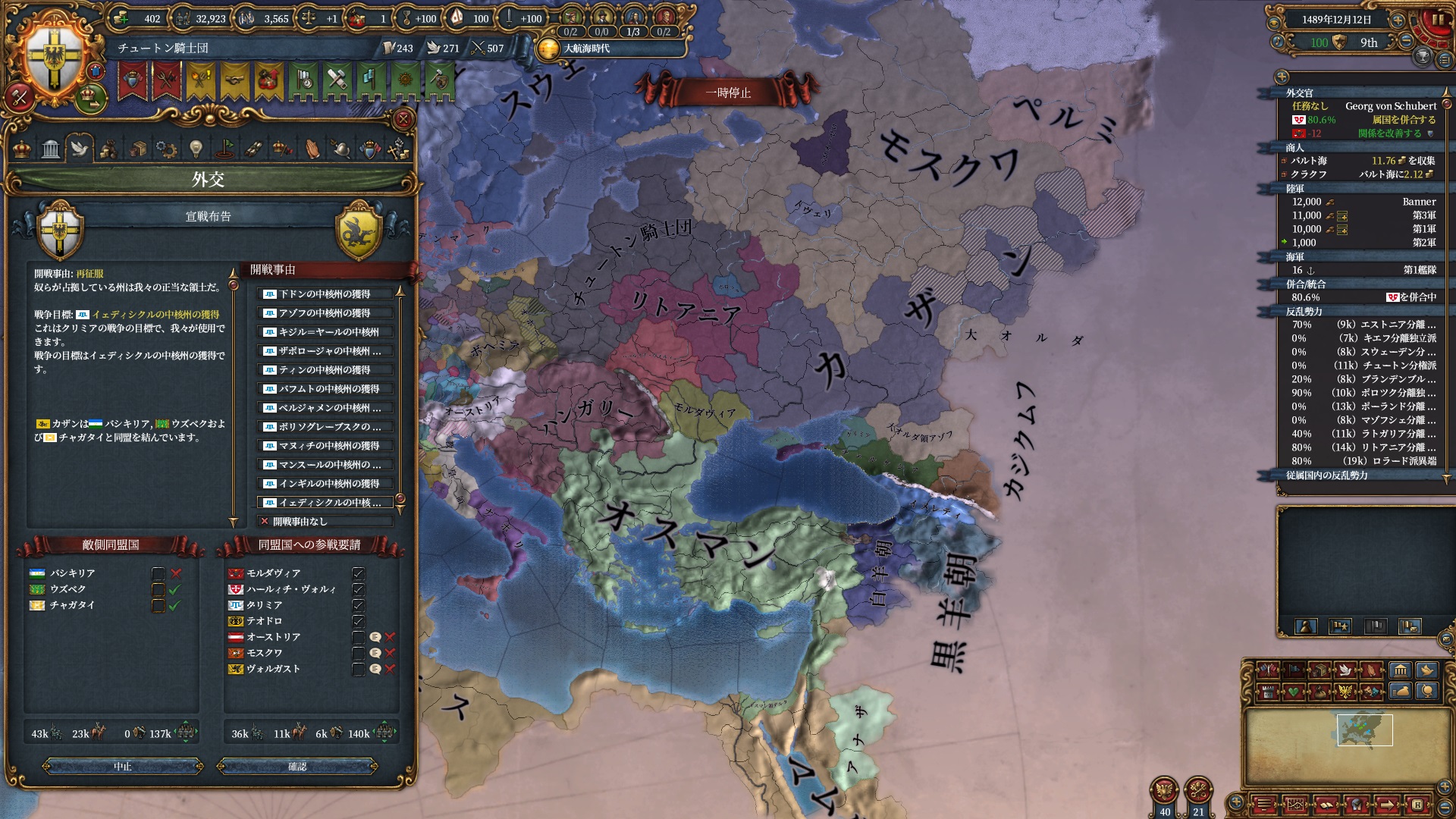 モスクワは外交関係が微妙になりがちですが、敵の敵補正でオスマンやHRE皇帝と組むことがちらほらあるのでかなり警戒したい相手です。