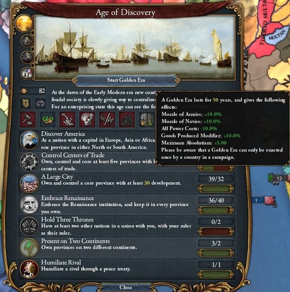 本プレイにおける黄金時代の最大の恩恵は陸海軍の士気上昇で、陸軍大国を相手取るのに効果を発揮してくれます。
