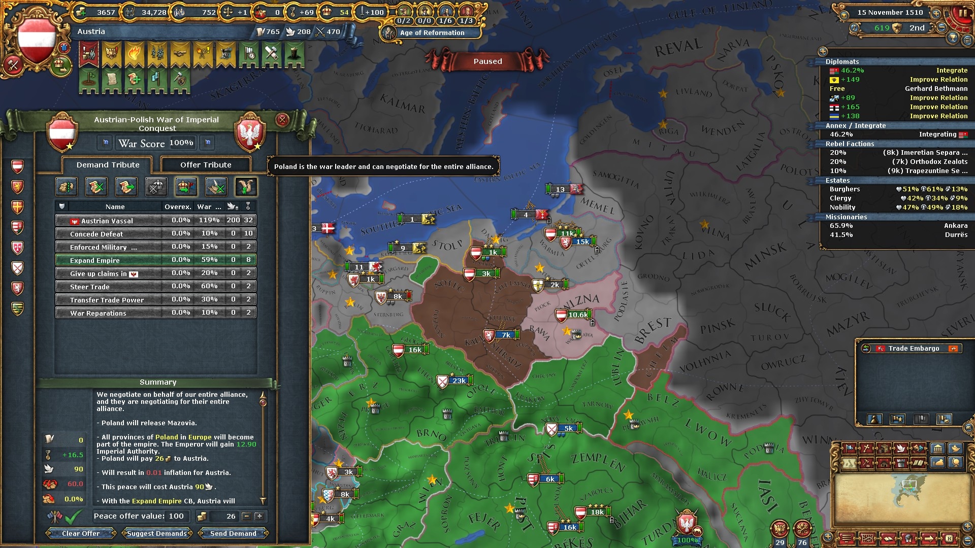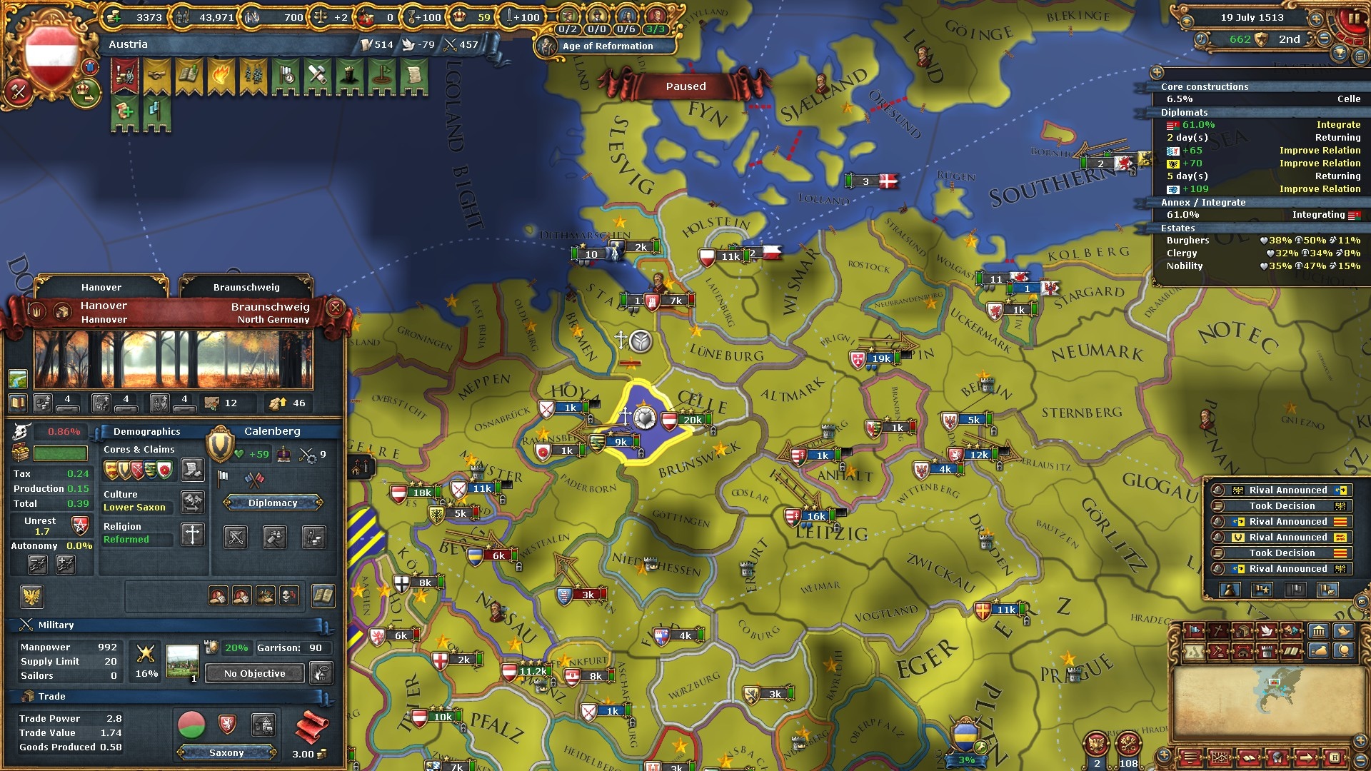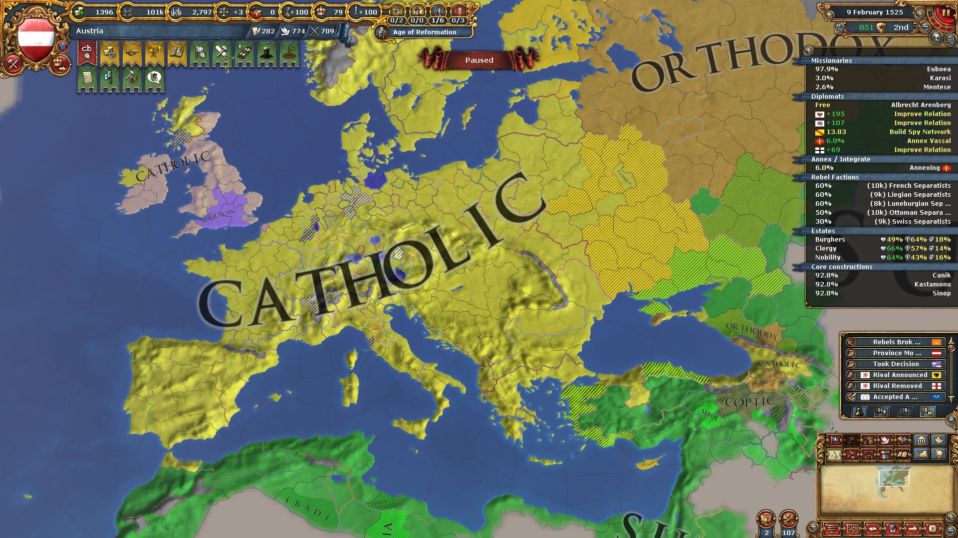 ミッション「ハプスブルク家の拡大(Spread the von Habsburgs)」報酬の外交併合コスト-20%を活用しています。