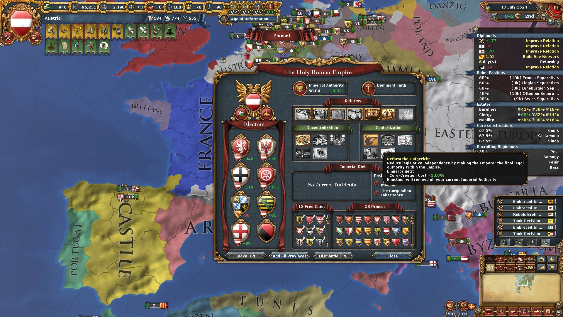 自由都市から得られる帝国権威が増加します。また、集権・分権ルートが解禁されます。
